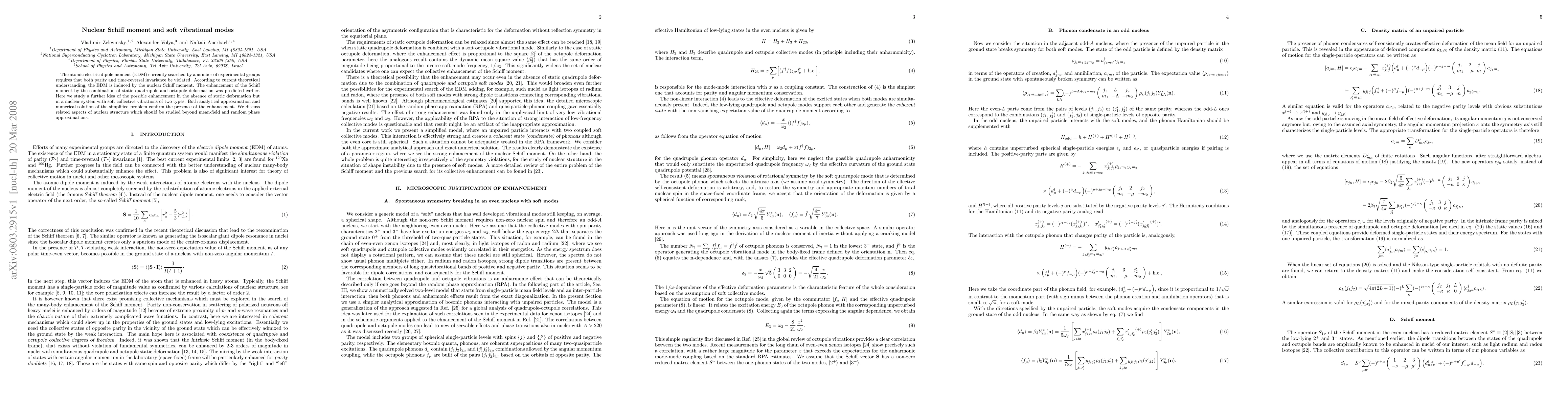 The atomic electric dipole moment (EDM) currently searched by a number of experimental groups requires that both parity and time-reversal invariance be violated. According to current theoretical understanding, the EDM is induced by the nuclear Schiff moment. The enhancement of the Schiff moment by the combination of static quadrupole and octupole deformation was predicted earlier. Here we study a further idea of the possible enhancement in the absence of static deformation but in a nuclear system with soft collective vibrations of two types. Both analytical approximation and numerical solution of the simplified problem confirm the presence of the enhancement. We discuss related aspects of nuclear structure which should be studied beyond mean-field and random phase approximations.