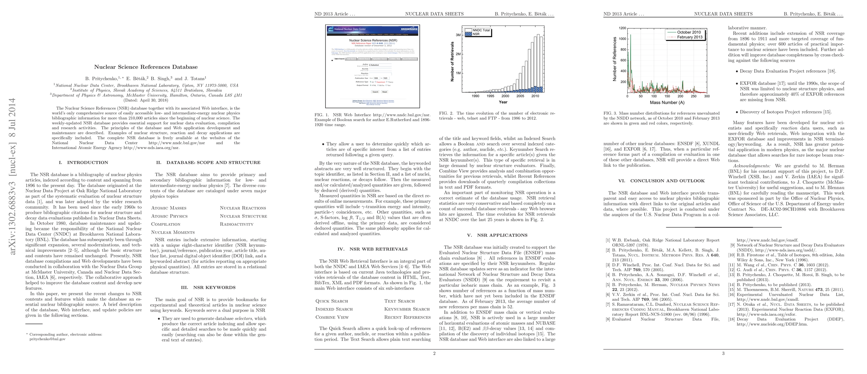 The Nuclear Science References (NSR) database offers comprehensive, accessible bibliographic information for over 210,000 nuclear physics articles, supporting nuclear data evaluation and research. It is freely available online and updated weekly through the National Nuclear Data Center and the International Atomic Energy Agency.