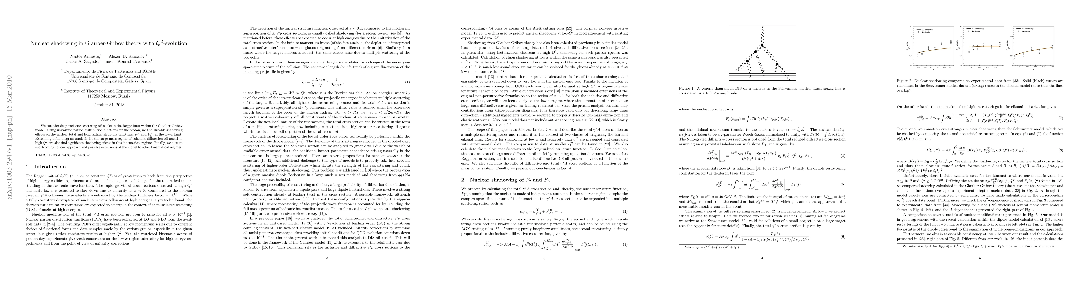 We consider deep inelastic scattering off nuclei in the Regge limit within the Glauber-Gribov model. Using unitarized parton distribution functions for the proton, we find sizeable shadowing effects on the nuclear total and longitudinal structure functions, $F_2^A$ and $F_L^A$, in the low-x limit. Extending a fan-diagram analysis for the large-mass region of coherent diffraction off nuclei to high Q2, we also find significant shadowing effects in this kinematical regime. Finally, we discuss shortcomings of our approach and possible extensions of the model to other kinematical regimes.