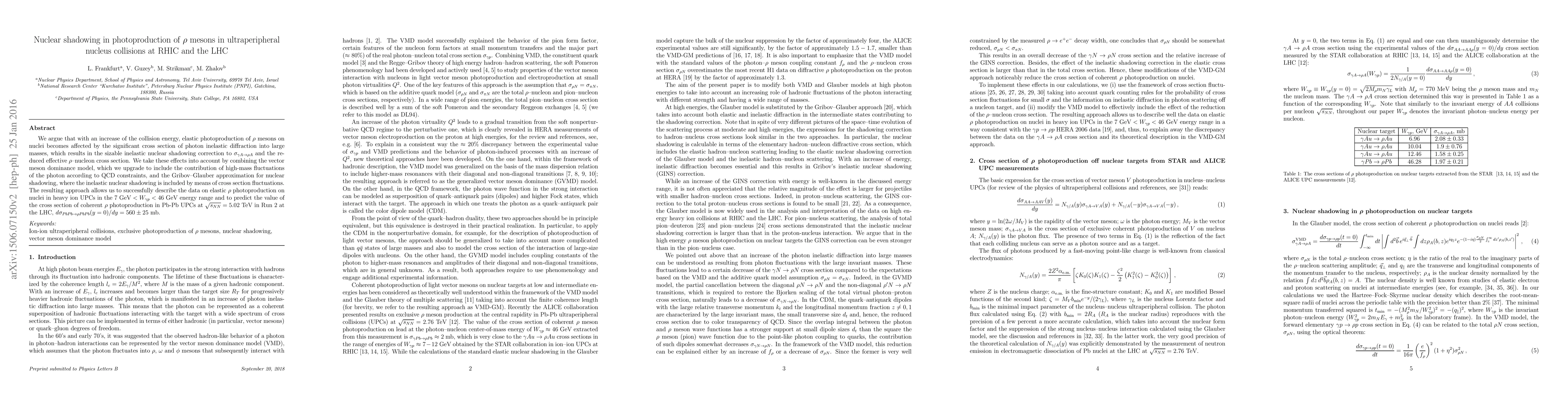 We argue that with an increase of the collision energy, elastic photoproduction of $\rho$ mesons on nuclei becomes affected by the significant cross section of photon inelastic diffraction into large masses, which results in the sizable inelastic nuclear shadowing correction to $\sigma_{\gamma A \to \rho A}$ and the reduced effective $\rho$-nucleon cross section. We take these effects into account by combining the vector meson dominance model, which we upgrade to include the contribution of high-mass fluctuations of the photon according to QCD constraints, and the Gribov-Glauber approximation for nuclear shadowing, where the inelastic nuclear shadowing is included by means of cross section fluctuations. The resulting approach allows us to successfully describe the data on elastic $\rho$ photoproduction on nuclei in heavy ion UPCs in the $7 \ {\rm GeV} < W_{\gamma p} < 46$ GeV energy range and to predict the value of the cross section of coherent $\rho$ photoproduction in Pb-Pb UPCs at $\sqrt{s_{NN}}=5.02$ TeV in Run 2 at the LHC, $d\sigma_{Pb Pb \to \rho Pb Pb} (y=0)/dy= 560 \pm 25$ mb.