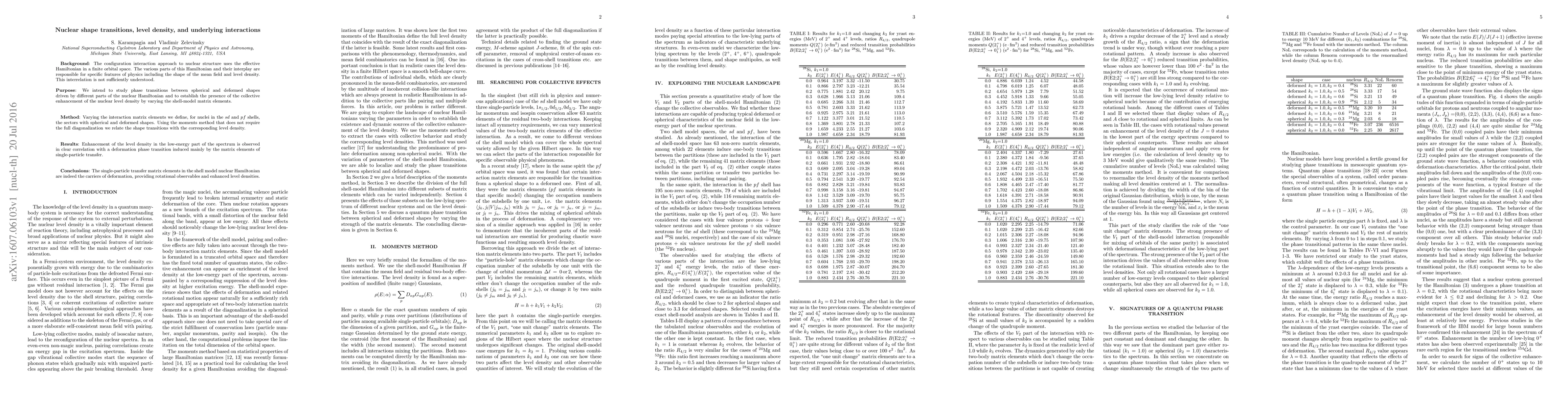 The configuration interaction approach to nuclear structure uses the effective Hamiltonian in a finite orbital space. The various parts of this Hamiltonian and their interplay are responsible for specific features of physics including the shape of the mean field and level density. This interrelation is not sufficiently understood. We intend to study phase transitions between spherical and deformed shapes driven by different parts of the nuclear Hamiltonian and to establish the presence of the collective enhancement of the nuclear level density by varying the shell-model matrix elements. Varying the interaction matrix elements we define, for nuclei in the sd and pf shells, the sectors with spherical and deformed shapes. Using the moments method that does not require the full diagonalization we relate the shape transitions with the corresponding level density. Enhancement of the level density in the low-energy part of the spectrum is observed in clear correlation with a deformation phase transition induced mainly by the matrix elements of single-particle transfer. The single-particle transfer matrix elements in the shell model nuclear Hamiltonian are indeed the carriers of deformation, providing rotational observables and enhanced level densities.