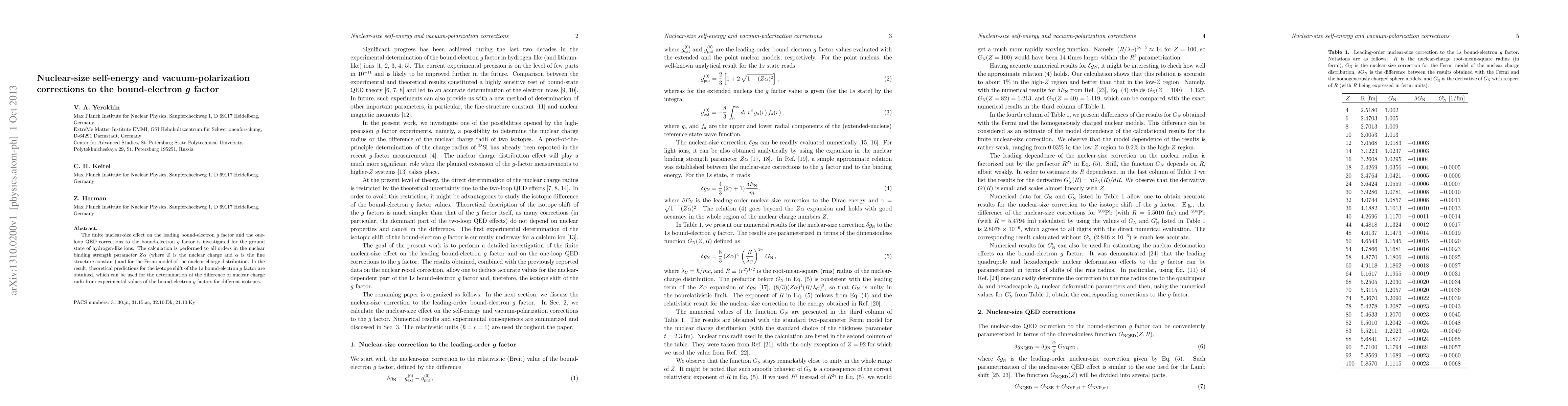 The finite nuclear-size effect on the leading bound-electron g factor and the one-loop QED corrections to the bound-electron g factor is investigated for the ground state of hydrogen-like ions. The calculation is performed to all orders in the nuclear binding strength parameter Z\alpha\ (where Z is the nuclear charge and \alpha\ is the fine structure constant) and for the Fermi model of the nuclear charge distribution. In the result, theoretical predictions for the isotope shift of the 1s bound-electron g factor are obtained, which can be used for the determination of the difference of nuclear charge radii from experimental values of the bound-electron g factors for different isotopes.