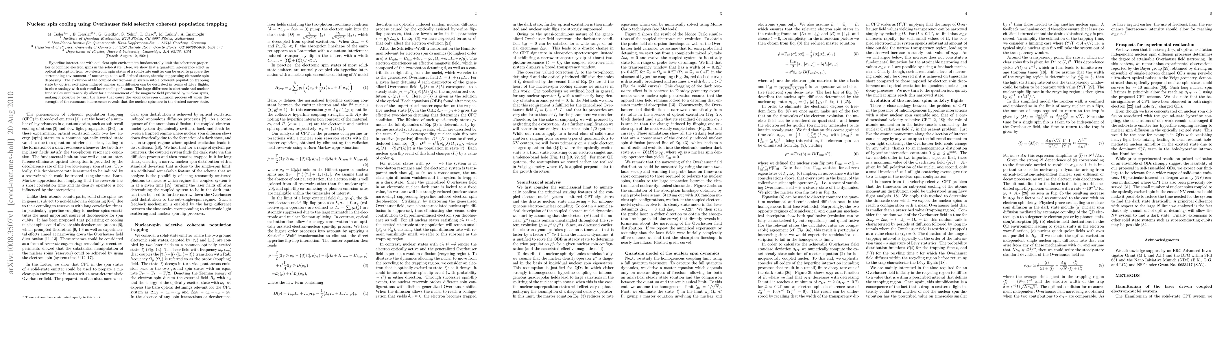 This paper demonstrates a method to cool nuclear spins using optical absorption interference in solid-state emitters, achieving suppression of electronic spin dephasing through coherent population trapping. The process, analogous to sub-recoil laser cooling, allows for precise control of nuclear spin states and measurement of their magnetic field.
