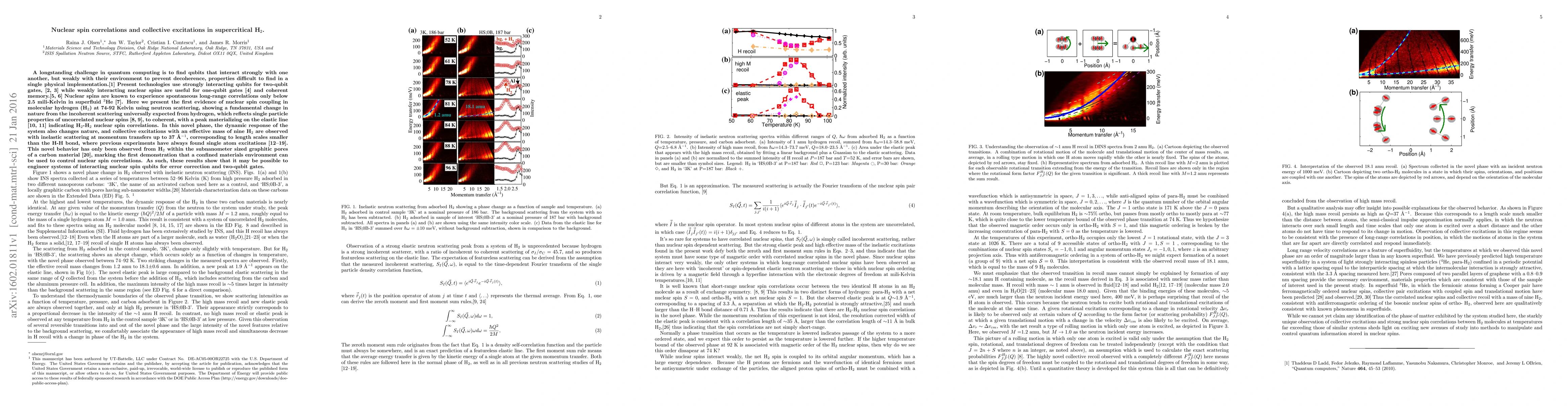 Nuclear spins are known to experience spontaneous long-range correlations only below 2.5 mili-Kelvin in superfluid $^3$He. Here we present the first evidence of nuclear spin coupling in molecular hydrogen (H$_2$) at 74-92 Kelvin using neutron scattering, showing a fundamental change in nature from the incoherent scattering universally expected from hydrogen, which reflects single particle properties of uncorrelated nuclear spins, to coherent, with a peak materializing on the elastic line, indicating H$_2$-H$_2$ nuclear spin correlations. In this novel phase, the dynamic response of the system also changes nature, and collective excitations with an effective mass of nine H$_2$ are observed with inelastic scattering at momentum transfers up to 37 \AA$^{-1}$, corresponding to length scales smaller than the H-H bond, where previous experiments have always found single atom excitations. This novel behavior has only been observed from H$_2$ within the subnanometer sized graphitic pores of a carbon material, marking the first demonstration that a confined materials environment can be used to control nuclear spin correlations.