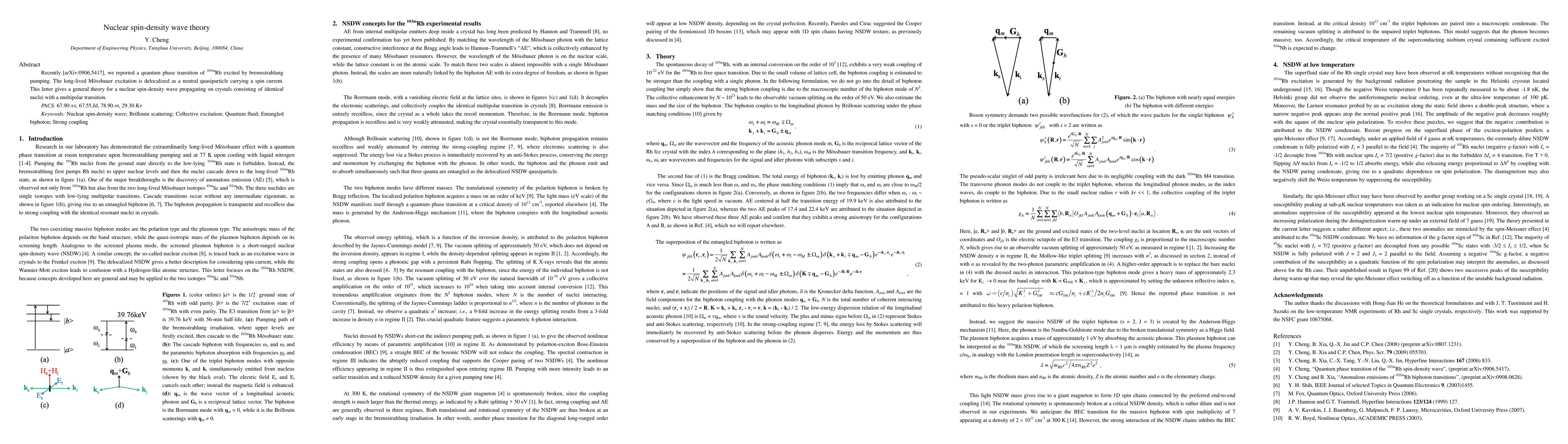 Recently [arXiv:0906.5417], we reported a quantum phase transition of 103mRh excited by bremsstrahlung pumping. The long-lived Moessbauer excitation is delocalized as a neutral quasiparticle carrying a spin current. This letter gives a general theory for a nuclear spin-density wave propagating on crystals consisting of identical nuclei with a multipolar transition.