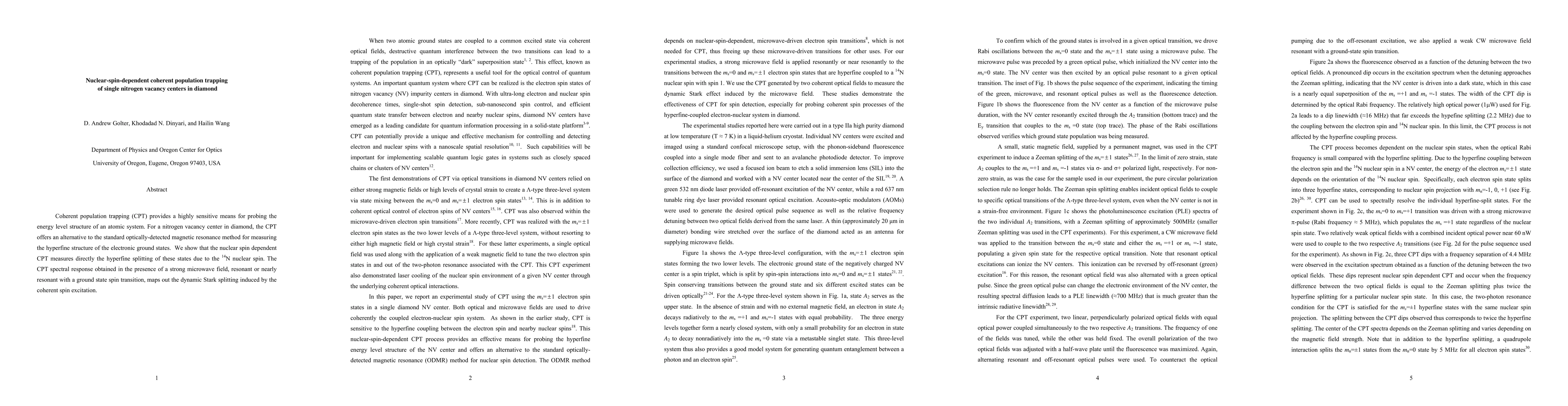 This paper demonstrates the use of nuclear-spin-dependent coherent population trapping (CPT) in nitrogen vacancy centers of diamond to directly measure the hyperfine splitting caused by 14N nuclear spin, providing a sensitive alternative to standard optically-detected magnetic resonance methods. The CPT spectral response in a strong microwave field reveals dynamic Stark splitting from coherent spin excitation.