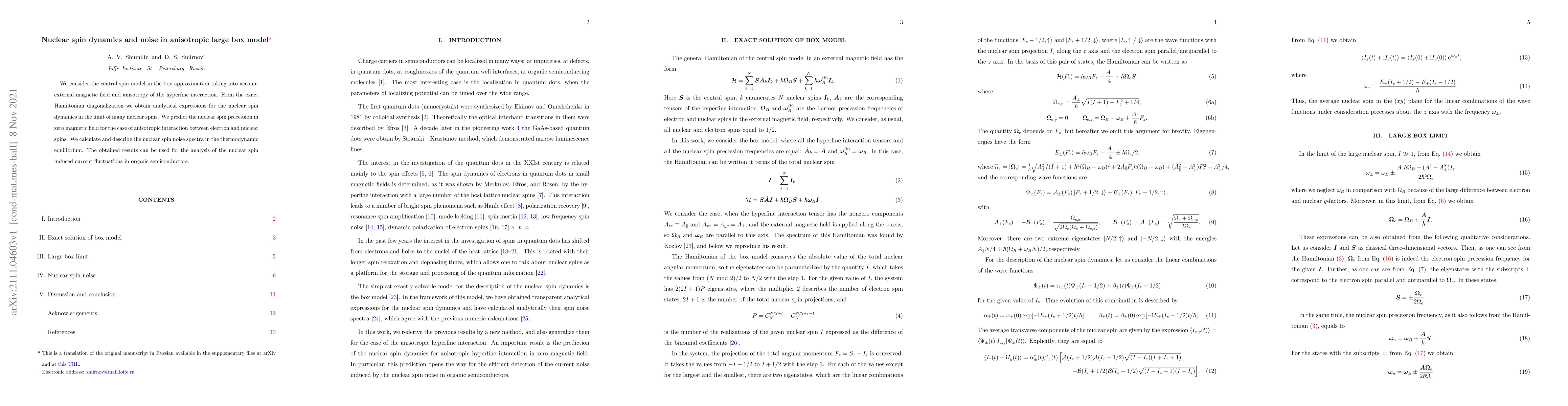 This paper investigates the dynamics and noise in nuclear spin systems using the central spin model in an anisotropic large box approximation, revealing analytical expressions for nuclear spin precession and noise spectra, which are applicable to analyzing nuclear spin-induced current fluctuations in organic semiconductors.