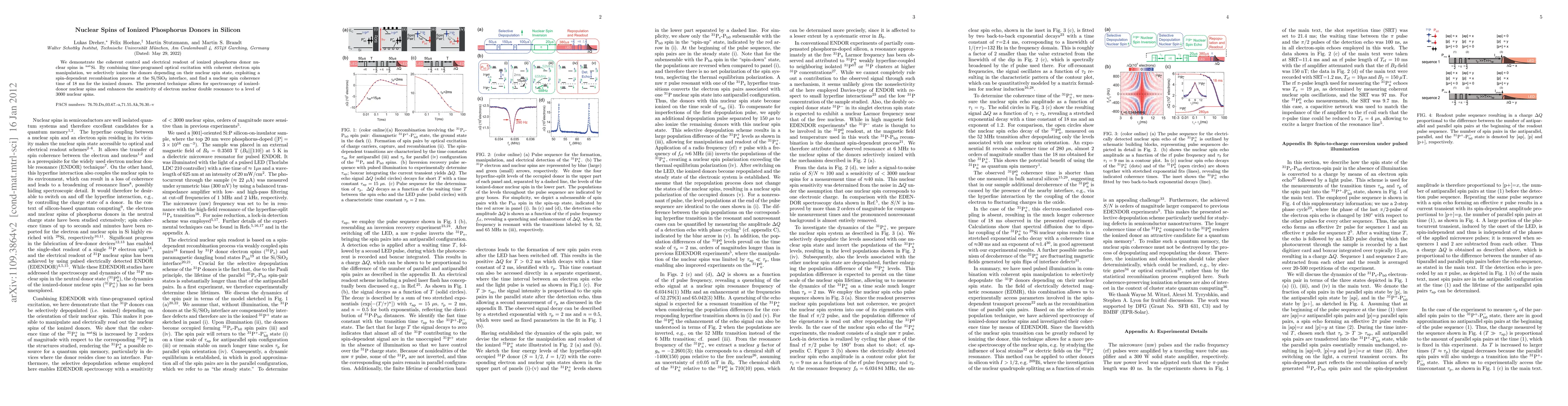 This paper demonstrates coherent control and electrical readout of nuclear spins in ionized phosphorus donors in silicon, achieving nuclear-spin coherence times two orders of magnitude longer than in neutral states. The techniques presented enhance sensitivity and allow for spectroscopy, positioning ionized donors as potential quantum memory resources.