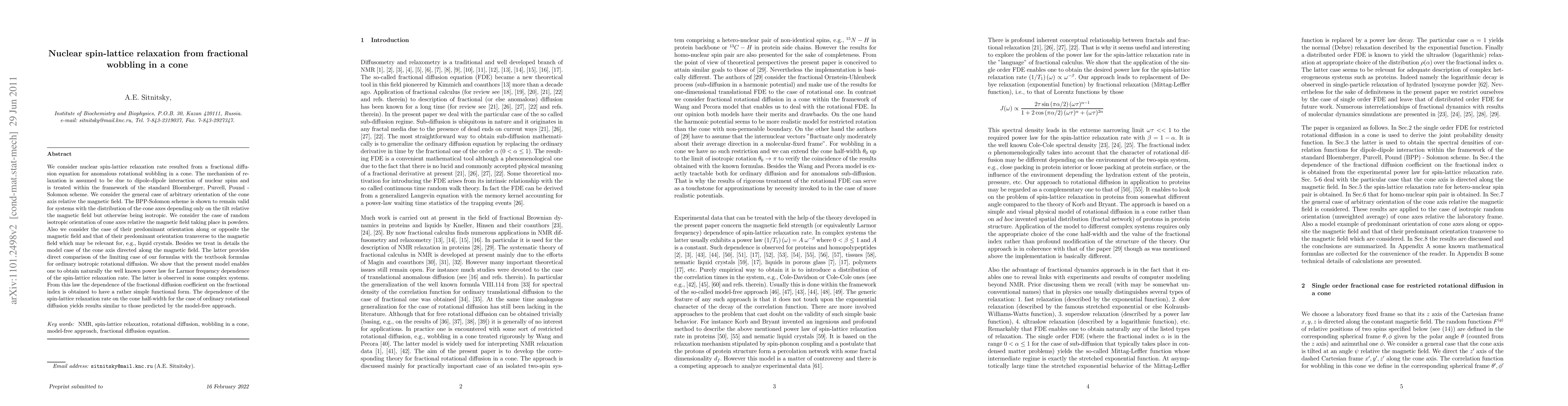 We consider nuclear spin-lattice relaxation rate resulted from a fractional diffusion equation for anomalous rotational wobbling in a cone. The mechanism of relaxation is assumed to be due to dipole-dipole interaction of nuclear spins and is treated within the framework of the standard Bloemberger, Purcell, Pound - Solomon scheme. We consider the general case of arbitrary orientation of the cone axis relative the magnetic field. The BPP-Solomon scheme is shown to remain valid for systems with the distribution of the cone axes depending only on the tilt relative the magnetic field but otherwise being isotropic. We consider the case of random isotropic orientation of cone axes relative the magnetic field taking place in powders. Also we consider the case of their predominant orientation along or opposite the magnetic field and that of their predominant orientation transverse to the magnetic field which may be relevant for, e.g., liquid crystals. Besides we treat in details the model case of the cone axis directed along the magnetic field. The latter provides direct comparison of the limiting case of our formulas with the textbook formulas for ordinary isotropic rotational diffusion. We show that the present model enables one to obtain naturally the well known power law for Larmor frequency dependence of the spin-lattice relaxation rate. The latter is observed in some complex systems. From this law the dependence of the fractional diffusion coefficient on the fractional index is obtained to have a rather simple functional form. The dependence of the spin-lattice relaxation rate on the cone half-width for the case of ordinary rotational diffusion yields results similar to those predicted by the model-free approach.