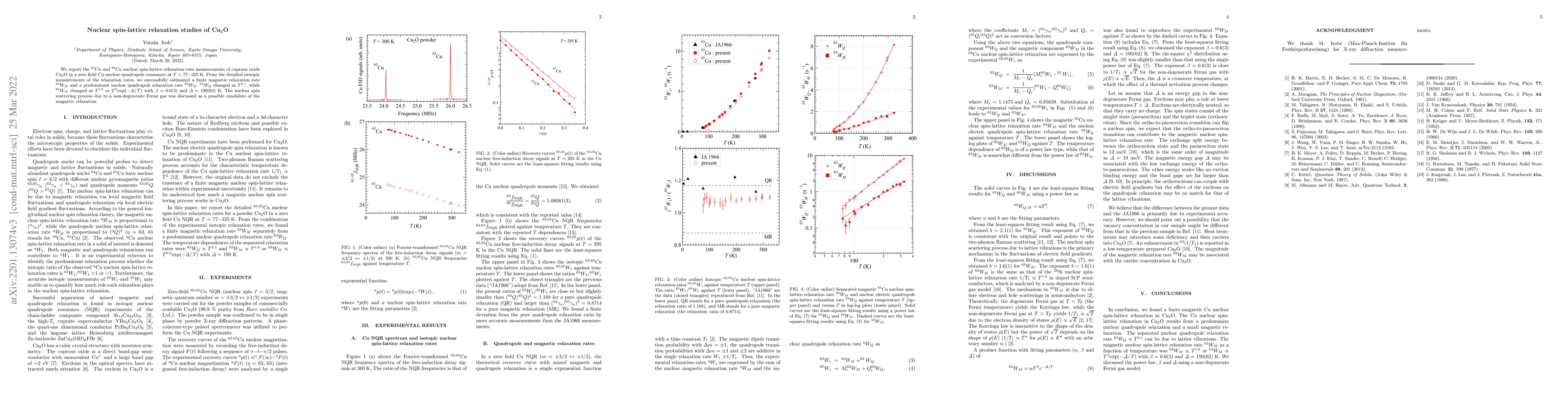 We report the $^{63}$Cu and $^{65}$Cu nuclear spin-lattice relaxation rate measurements of cuprous oxide Cu$_2$O in a zero field Cu nuclear quadrupole resonance at $T$ = 77$-$325 K. From the detailed isotopic measurements of the relaxation rates, we successfully estimated a finite magnetic relaxation rate $^{63}W_M$ and a predominant nuclear quadrupole relaxation rate $^{63}W_Q$. $^{63}W_Q$ changed as $T^{2.1}$, while $^{63}W_M$ changed as $T^{1.6}$ or $T^{\beta}\mathrm{exp}(-\it\Delta/T)$ with $\beta$ = 0.6(3) and $\it\Delta$ = 190(62) K. The nuclear spin scattering process due to a non-degenerate Fermi gas was discussed as a possible candidate of the magnetic relaxation.