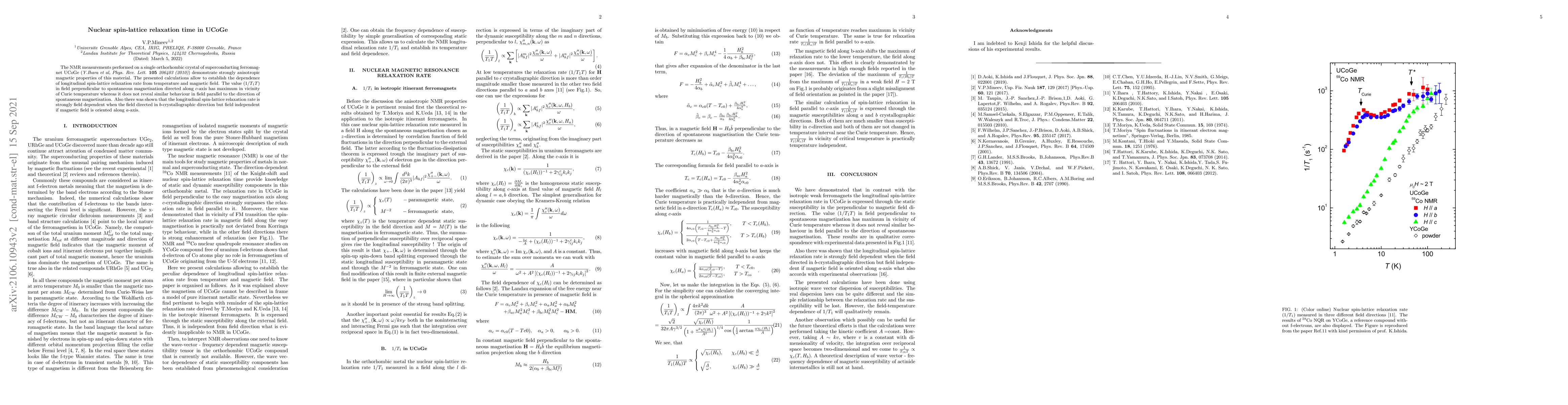 Researchers studied UCoGe, a superconducting ferromagnet, and found that its spin-lattice relaxation rate is highly dependent on temperature and magnetic field orientation, with maximum values near the Curie temperature in specific directions.