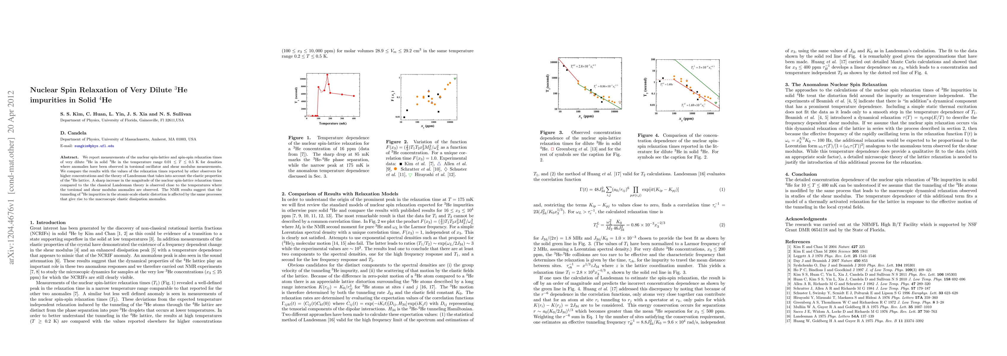 This study investigates nuclear spin relaxation times of very dilute 3He impurities in solid 4He, revealing a sharp increase in nuclear spin-lattice relaxation times near temperatures where torsional and shear modulus anomalies occur, suggesting a connection between impurity tunneling and macroscopic elastic dissipation. The findings contrast with classical theory and imply a common underlying process affecting both phenomena.