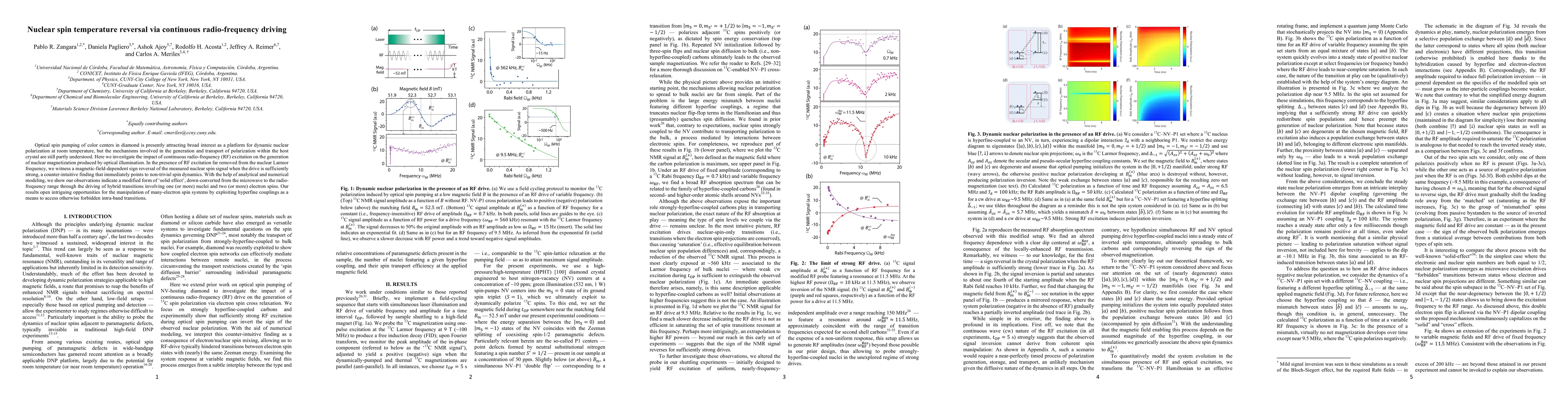 This paper investigates the impact of continuous radio-frequency excitation on nuclear spin polarization in diamond color centers, revealing a magnetic-field-dependent reversal of nuclear spin signals. The findings suggest a modified 'solid effect' mechanism, enabling the manipulation of many-electron spin systems via hyperfine couplings.