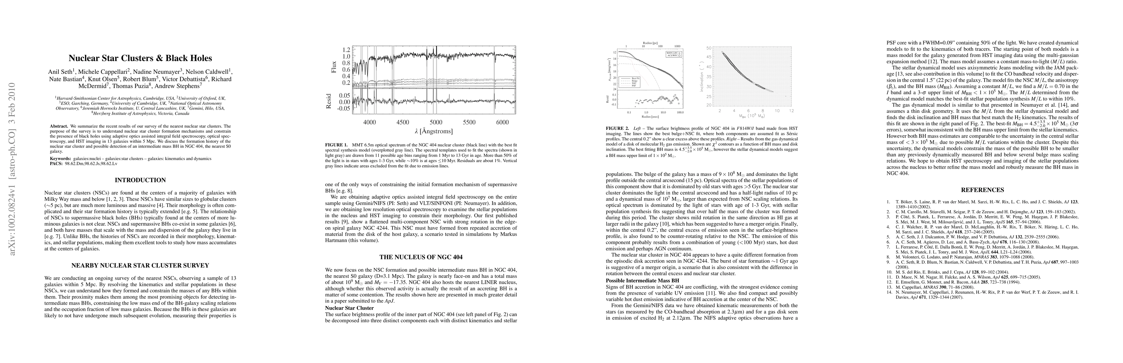 We summarize the recent results of our survey of the nearest nuclear star clusters. The purpose of the survey is to understand nuclear star cluster formation mechanisms and constrain the presence of black holes using adaptive optics assisted integral field spectroscopy, optical spectroscopy, and HST imaging in 13 galaxies within 5 Mpc. We discuss the formation history of the nuclear star cluster and possible detection of an intermediate mass BH in NGC 404, the nearest S0 galaxy.