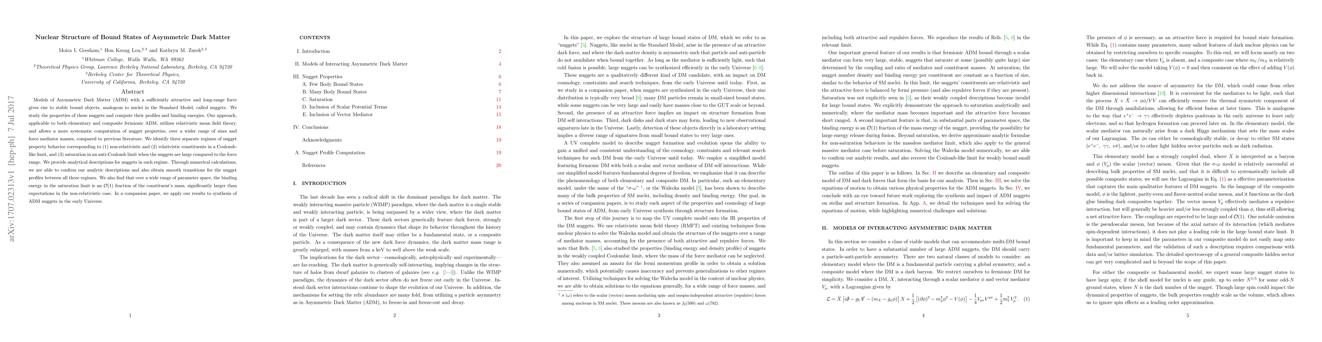 Models of Asymmetric Dark Matter (ADM) with a sufficiently attractive and long-range force gives rise to stable bound objects, analogous to nuclei in the Standard Model, called nuggets. We study the properties of these nuggets and compute their profiles and binding energies. Our approach, applicable to both elementary and composite fermionic ADM, utilizes relativistic mean field theory, and allows a more systematic computation of nugget properties, over a wider range of sizes and force mediator masses, compared to previous literature. We identify three separate regimes of nugget property behavior corresponding to (1) non-relativistic and (2) relativistic constituents in a Coulomb-like limit, and (3) saturation in an anti-Coulomb limit when the nuggets are large compared to the force range. We provide analytical descriptions for nuggets in each regime. Through numerical calculations, we are able to confirm our analytic descriptions and also obtain smooth transitions for the nugget profiles between all three regimes. We also find that over a wide range of parameter space, the binding energy in the saturation limit is an ${\cal O}(1)$ fraction of the constituent's mass, significantly larger than expectations in the non-relativistic case. In a companion paper, we apply our results to synthesis of ADM nuggets in the early Universe.