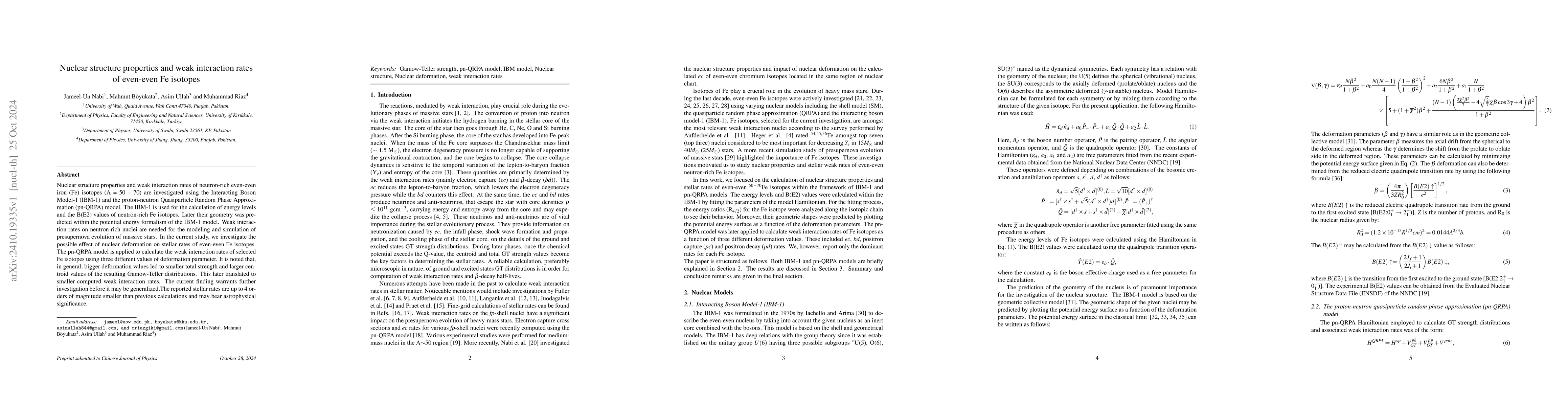 This study investigates nuclear structure properties and weak interaction rates of neutron-rich even-even Fe isotopes using IBM1 and pnQRPA models. The research reveals that larger deformations in these isotopes lead to significantly reduced weak interaction rates, which could impact stellar evolution simulations.