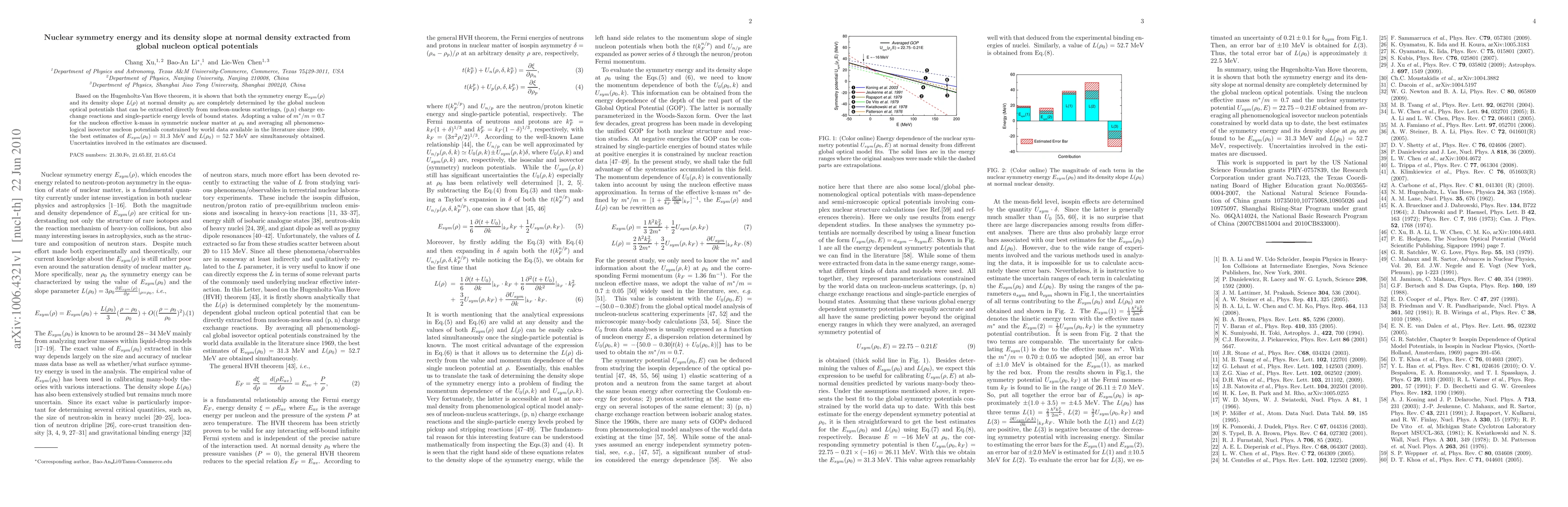 Based on the Hugenholtz-Van Hove theorem, it is shown that both the symmetry energy E$_{sym}(\rho)$ and its density slope $L(\rho)$ at normal density $\rho_0$ are completely determined by the global nucleon optical potentials that can be extracted directly from nucleon-nucleus scatterings, (p,n) charge exchange reactions and single-particle energy levels of bound states. Adopting a value of $m^*/m=0.7$ for the nucleon effective k-mass in symmetric nuclear matter at $\rho_0$ and averaging all phenomenological isovector nucleon potentials constrained by world data available in the literature since 1969, the best estimates of $E_{sym}(\rho_0)=31.3$ MeV and $L(\rho_0)=52.7$ MeV are simultaneously obtained. Uncertainties involved in the estimates are discussed.