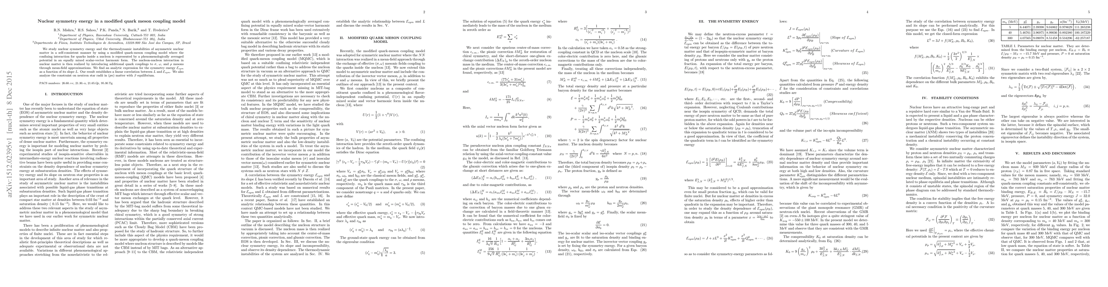 This paper investigates nuclear symmetry energy and thermodynamic instabilities in asymmetric nuclear matter using a modified quark-meson coupling model. It finds a linear correlation between the slope of symmetry energy and its value, and analyzes neutron star radii constraints in beta-equilibrium matter.