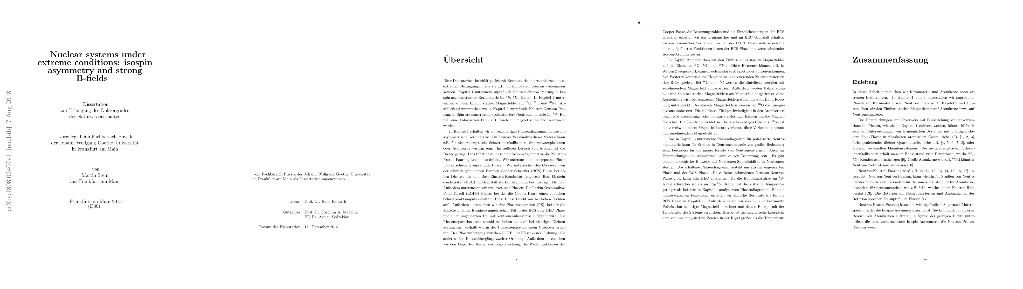 This thesis explores nuclear systems under extreme conditions of isospin asymmetry and strong magnetic fields. Its first chapter is devoted to the phase diagram of isospin-asymmetrical nuclear matter in the density-temperature plane. Four competing phases of matter are included into the consideration: the unpaired phase, the ordinary Bardeen-Cooper-Schrieffer (BCS) phase, a phase where normal fluid and superfluid separate into distinct domains and the superfluid phase with a non-zero total momentum of Cooper pairs. The evolution of these phases from the weakly BCS limit to the strongly coupled Bose-Einstein-Condensate limit is studied by varying the density from high to low values at various temperatures and asymmetries. The emergence of tri-critical points (including a Lifshitz point) and various intrinsic properties of the condensate (pair wave-function, occupation numbers, quasiparticle spectra) are discussed. The second chapter studies the nuclei $^{12}$C, $^{16}$O, and $^{20}$Ne in a magnetic field $B\approx 10^{17}\,$G by utilizing the SKY3D code, suitably extended to include the magnetic field. Our solutions of time-independent Hartree-Fock equations on a Cartesian three-dimensional grid with a Skyrme interaction demonstrate a number of interesting phenomena, such as level splitting in the magnetic field, spontaneous rearrangement of energy levels, changes in the nuclear shape, etc. The third chapter studies the pairing in low-density neutron matter in the presence of a strong magnetic field. In particular, we find the limiting field for the destruction of the superfluidity of neutrons in the crust and outer core of magnetars. This field is density-dependent but is generally of the order of $B\geq 10^{17}\,$G. The phase diagram of spin-polarized neutron matter is constructed in the case where only the BCS phase is allowed along with the (spin-polarized) normal phase.