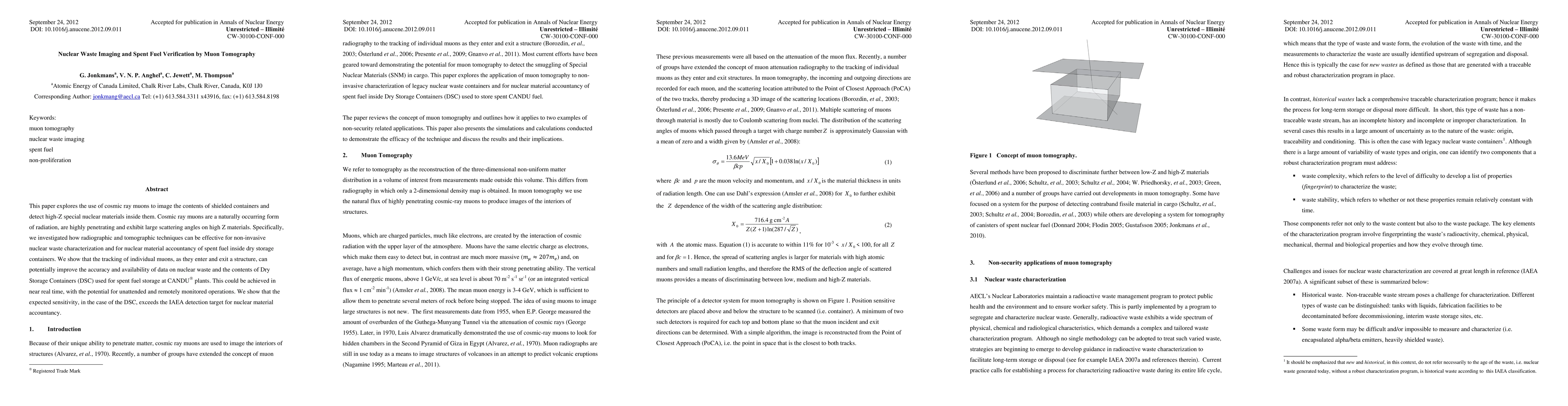 This paper investigates the use of cosmic ray muons for non-invasive imaging of shielded containers to detect high-Z special nuclear materials, demonstrating that muon tomography can enhance nuclear waste characterization and spent fuel verification, potentially meeting IAEA detection targets.