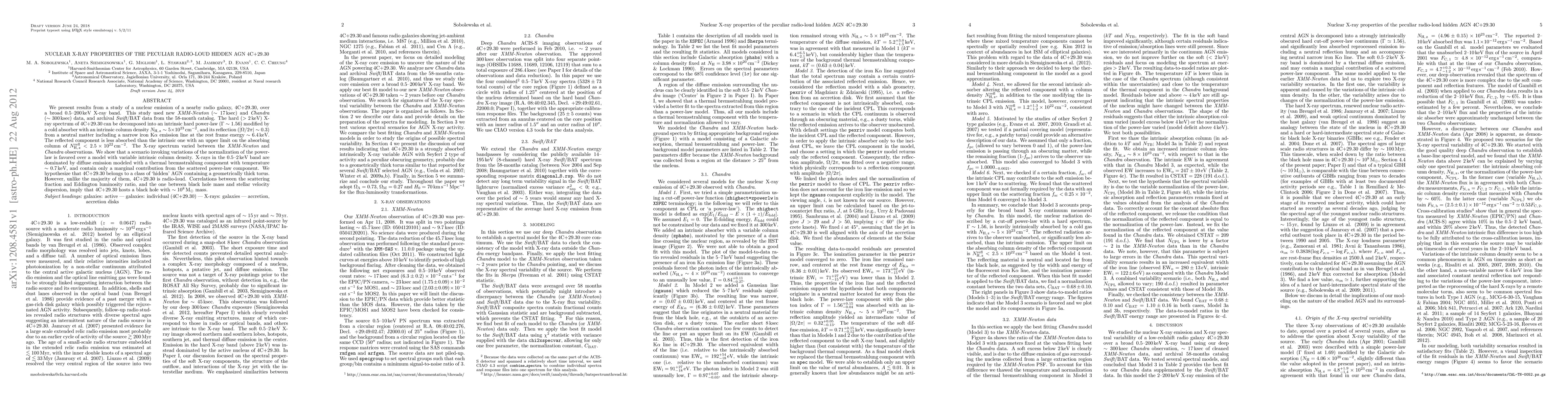 The paper studies X-ray properties of a radio-loud hidden Active Galactic Nucleus (AGN) 4C+29.30, finding an intrinsic hard power-law spectrum modified by a cold absorber, and suggesting the AGN hosts a black hole with approximately 10^8 solar masses.