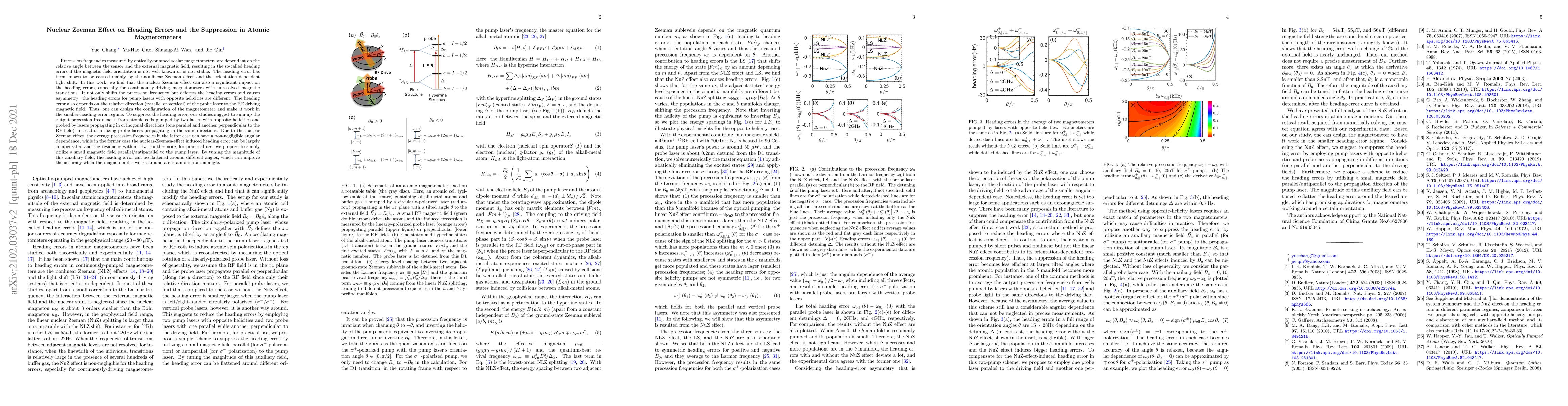 This paper investigates the impact of the nuclear Zeeman effect on heading errors in atomic magnetometers, revealing its significance in continuously-driving systems. To suppress these errors, the study proposes summing precession frequencies from cells pumped by lasers with opposite helicities and probed orthogonally, achieving a residue error within 1Hz.