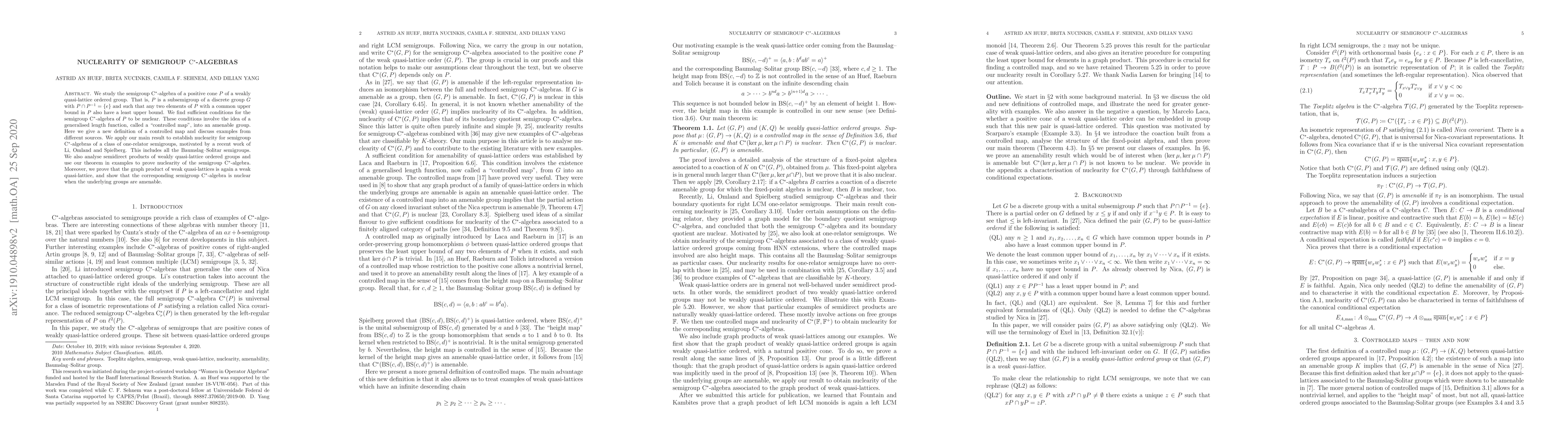 This paper investigates the nuclearity of semigroup C*-algebras associated with positive cones of weakly quasi-lattice ordered groups, establishing conditions involving controlled maps into amenable groups. It applies these findings to prove nuclearity for semigroup C*-algebras of one-relator semigroups and semidirect products, including Baumslag-Solitar semigroups.