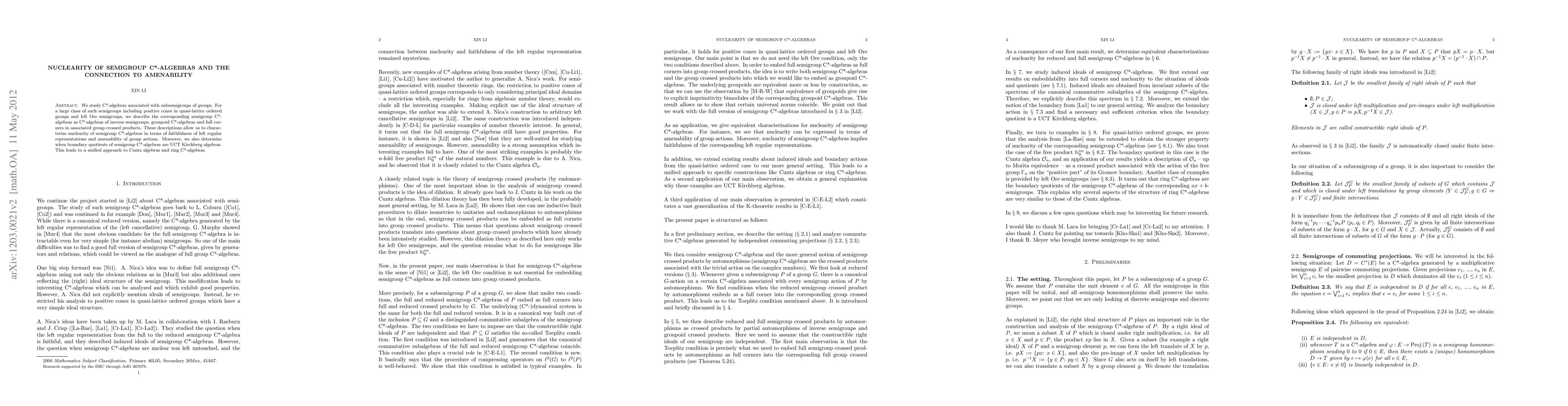 This paper explores C*-algebras linked to subsemigroups of groups, showing they can be represented as C*-algebras of inverse semigroups and groupoids. It characterizes nuclearity in terms of representation faithfulness and group action amenability, and determines when boundary quotients are UCT Kirchberg algebras, providing a unified view of Cuntz and ring C*-algebras.