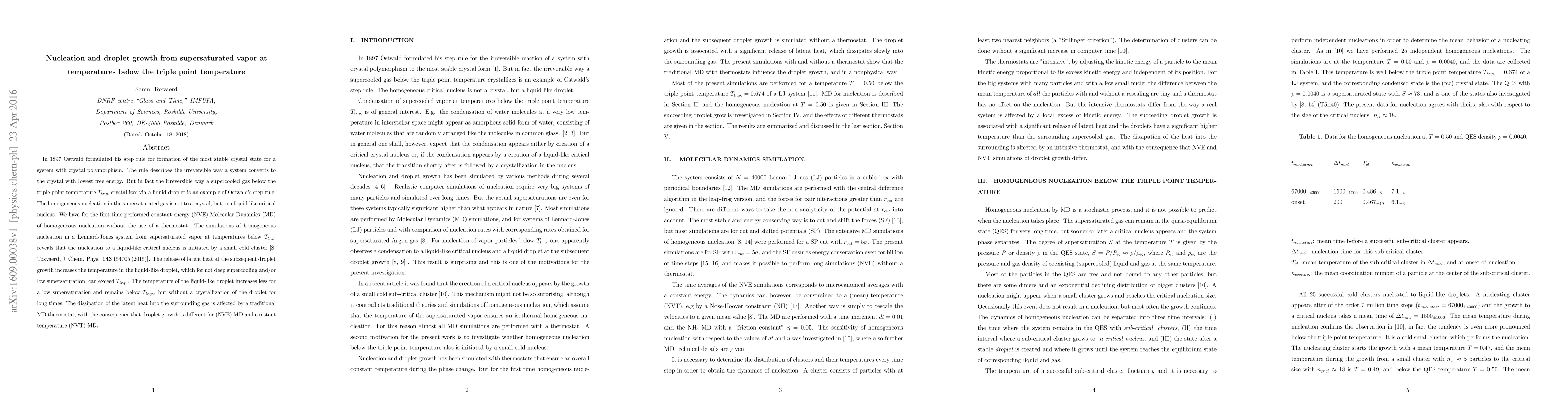 This study uses Molecular Dynamics simulations to explore nucleation and droplet growth from supersaturated vapor below the triple point temperature, demonstrating that nucleation first forms a liquid-like critical nucleus, rather than a crystal, consistent with Ostwald's step rule. The simulations reveal differing droplet growth behaviors under constant energy and constant temperature conditions.