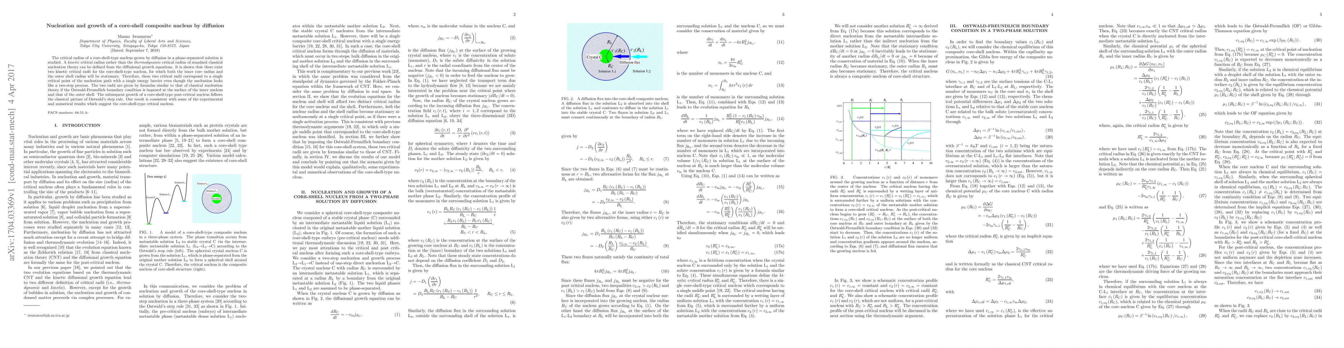 This paper investigates the nucleation and growth of a core-shell composite nucleus through diffusion in a phase-separated solution, defining a kinetic critical radius instead of the thermodynamic one. It reveals two kinetic critical radii corresponding to a single critical point and energy barrier, despite the two-step nucleation process.