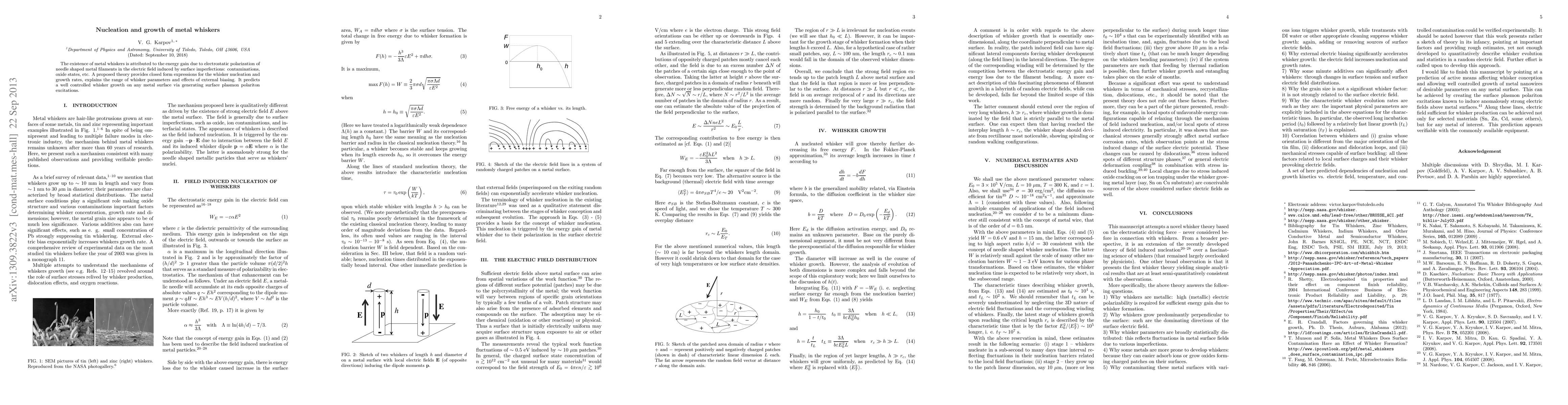 This paper proposes a theory explaining the nucleation and growth of metal whiskers, attributing their formation to electrostatic polarization in electric fields induced by surface imperfections. The theory offers closed form expressions for whisker growth rates and predicts controlled whisker growth through surface plasmon polariton excitations.