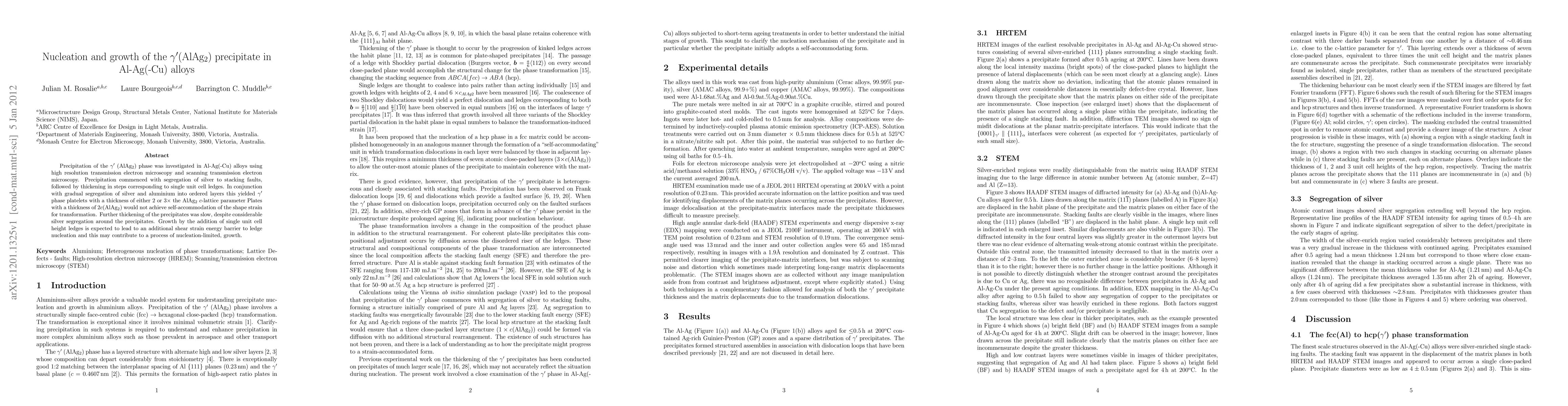 This study investigates the nucleation and growth of the \gamma' (AlAg2) phase in Al-Ag(-Cu) alloys using advanced electron microscopy techniques. The process begins with silver segregation to stacking faults, followed by stepwise thickening of precipitates, ultimately forming platelets that are either 2 or 3 times the AlAg2 c-lattice parameter. The thicker platelets face challenges in accommodating shape strain, suggesting a nucleation-limited growth mechanism.