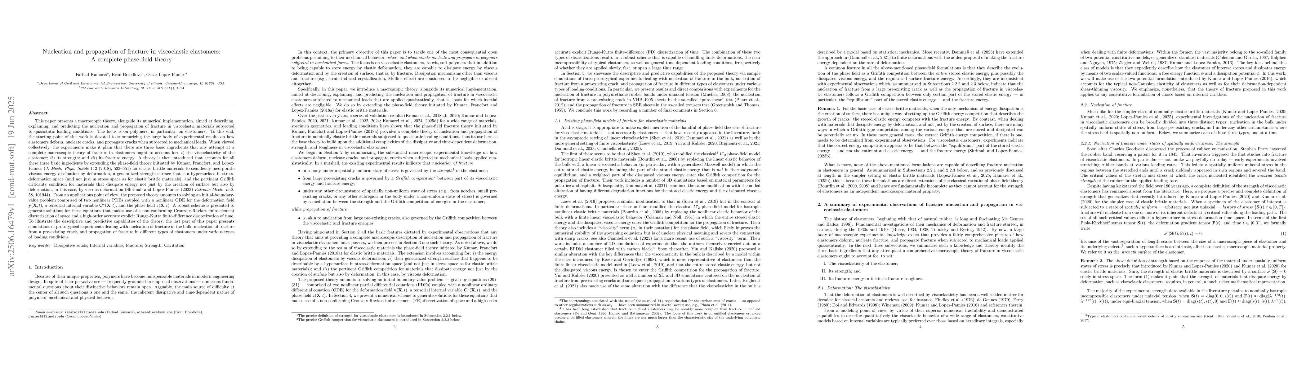 This paper presents a macroscopic theory, alongside its numerical implementation, aimed at describing, explaining, and predicting the nucleation and propagation of fracture in viscoelastic materials subjected to quasistatic loading conditions. The focus is on polymers, in particular, on elastomers. To this end, the starting point of this work is devoted to summarizing the large body of experimental results on how elastomers deform, nucleate cracks, and propagate cracks when subjected to mechanical loads. When viewed collectively, the experiments make it plain that there are three basic ingredients that any attempt at a complete macroscopic theory of fracture in elastomers ought to account for: i) the viscoelasticity of the elastomer; ii) its strength; and iii) its fracture energy. A theory is then introduced that accounts for all these three basic ingredients by extending the phase-field theory initiated by Kumar, Francfort, and Lopez-Pamies (J. Mech. Phys. Solids 112 (2018), 523--551) for elastic brittle materials to seamlessly incorporate viscous energy dissipation by deformation, a generalized strength surface that is a hypersurface in stress-deformation space (and not just in stress space as for elastic brittle materials), and the pertinent Griffith criticality condition for materials that dissipate energy not just by the creation of surface but also by deformation, in this case, by viscous deformation (Shrimali and Lopez-Pamies (2023) Extreme Mech. Lett. 58, 101944). From an applications point of view, the proposed theory amounts to solving an initial-boundary-value problem comprised of two nonlinear PDEs coupled with a nonlinear ODE for the deformation field, a tensorial internal variable, and the phase field. A robust scheme is presented to generate solutions for these equations.