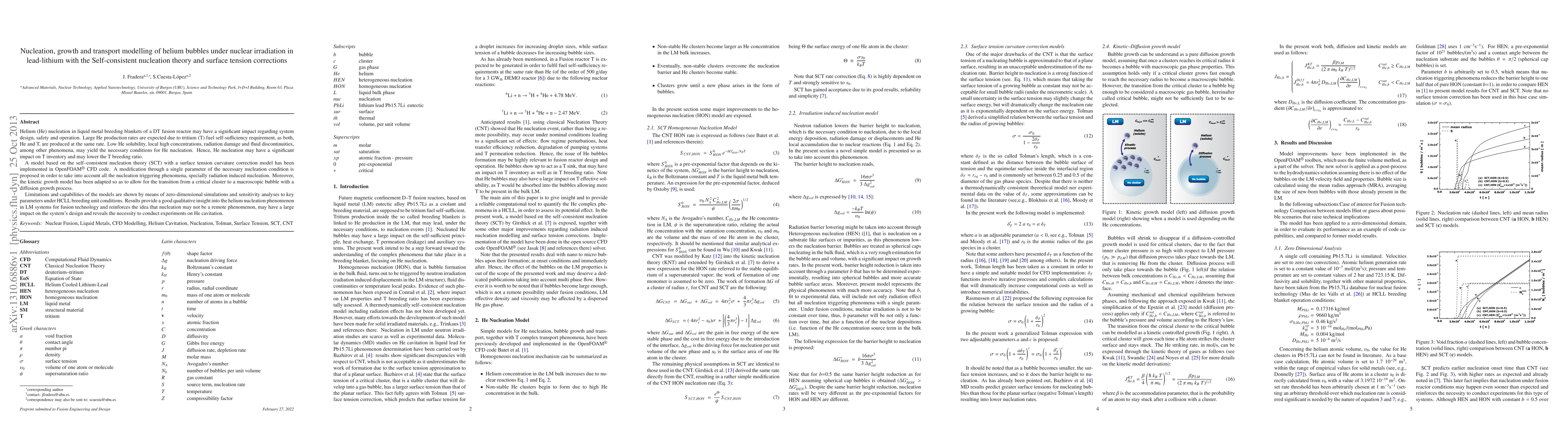 This paper models helium bubble nucleation, growth, and transport under nuclear irradiation in lead-lithium fusion reactors using self-consistent nucleation theory and surface tension corrections. The study highlights the significant impact of helium nucleation on tritium breeding ratios and system design, emphasizing the need for further experimental validation on helium cavitation.