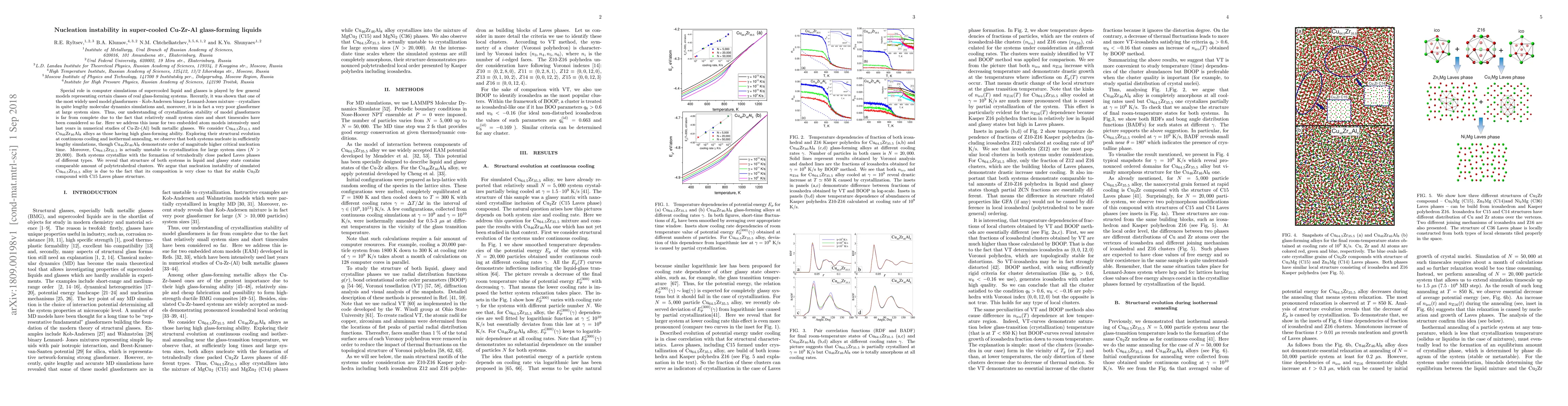 Special role in computer simulations of supercooled liquid and glasses is played by few general models representing certain classes of real glass-forming systems. Recently, it was shown that one of the most widely used model glassformers -- Kob-Andersen binary Lennard-Jones mixture -- crystalizes in quite lengthy molecular dynamics simulations and, moreover, it is in fact a very poor glassformer at large system sizes. Thus, our understanding of crystallization stability of model glassformers is far from complete due to the fact that relatively small system sizes and short timescales have been considered so far. Here we address this issue for two embedded atom models intensively used last years in numerical studies of Cu-Zr-(Al) bulk metallic glasses. We consider ${\rm Cu_{64.5}Zr_{35.5}}$ and ${\rm Cu_{46}Zr_{46}Al_{8}}$ alloys as those having high glass-forming ability. Exploring their structural evolution at continuous cooling and isothermal annealing, we observe that both systems nucleate in sufficiently lengthy simulations, though ${\rm Cu_{46}Zr_{46}Al_{8}}$ demonstrate order of magnitude higher critical nucleation time. Moreover, ${\rm Cu_{64.5}Zr_{35.5}}$ is actually unstable to crystallization for large system sizes ($N > 20,000$). Both systems crystallize with the formation of tetrahedrally close packed Laves phases of different types. We reveal that structure of both systems in liquid and glassy state contains comparable amount of polytetrahedral clusters. We argue that nucleation instability of simulated ${\rm Cu_{64.5}Zr_{35.5}}$ alloy is due to the fact that its composition is very close to that for stable ${\rm Cu_2 Zr}$ compound with C15 Laves phase structure.