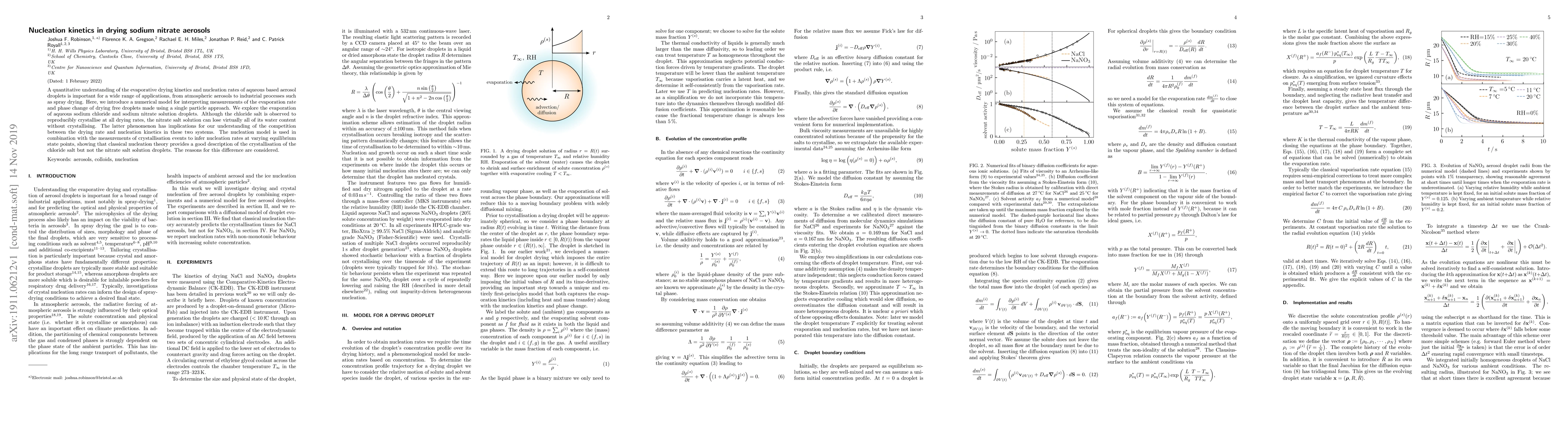 This paper develops a numerical model to study the evaporation and nucleation kinetics of drying sodium nitrate aerosols, revealing that while sodium chloride consistently crystallises, sodium nitrate can dry without crystallising. Classical nucleation theory accurately describes sodium chloride but not sodium nitrate, highlighting differing nucleation kinetics.