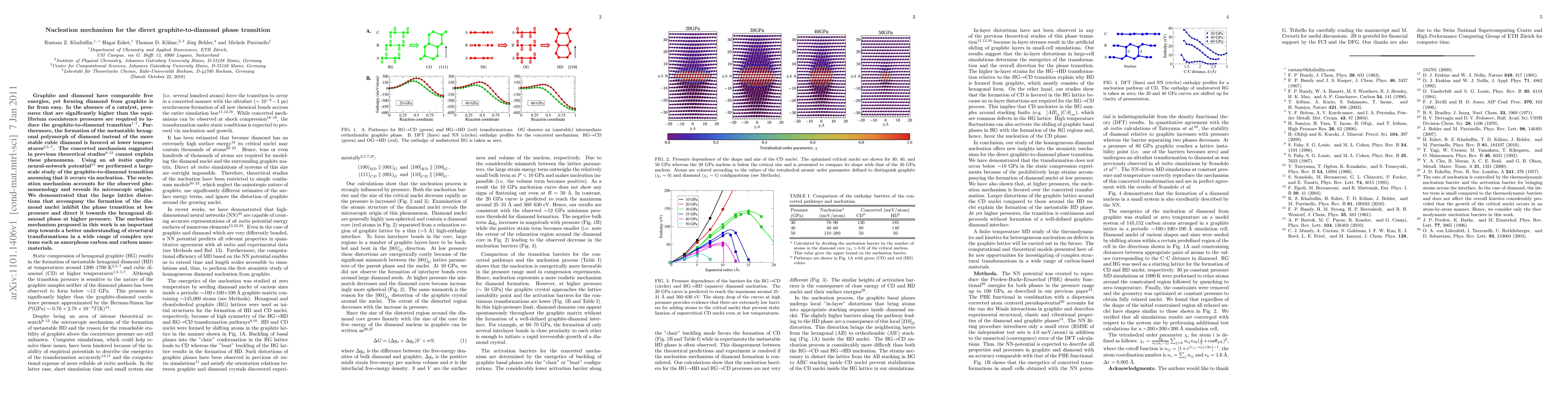 This research elucidates a nucleation mechanism for the direct graphite-to-diamond phase transition, revealing that lattice distortions accompanying diamond nucleus formation inhibit the transition at low pressure and favor hexagonal diamond at higher pressures. The findings advance understanding of structural transformations in complex carbon materials.