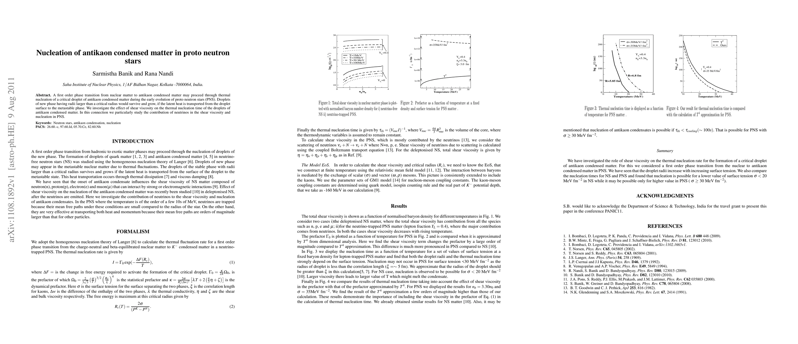 The paper presents a detailed analysis of shear viscosity's role in the thermal nucleation of antikaon condensed matter in PNS, considering neutrino contributions and comparing results with those for neutron stars.