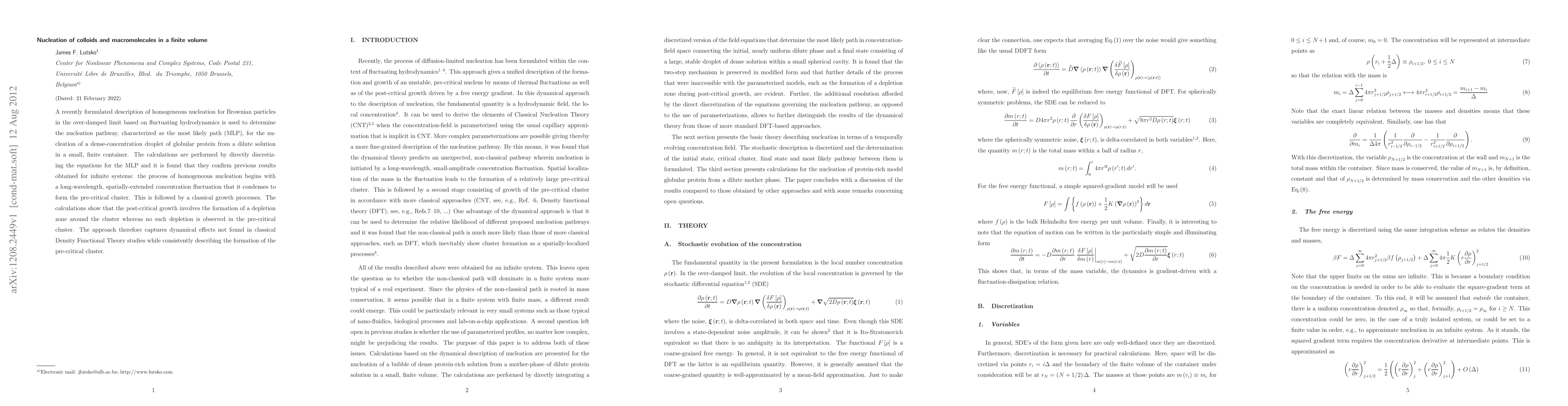 A recently formulated description of homogeneous nucleation for Brownian particles in the over-damped limit based on fluctuating hydrodynamics is used to determine the nucleation pathway, characterized as the most likely path (MLP), for the nucleation of a dense-concentration droplet of globular protein from a dilute solution in a small, finite container. The calculations are performed by directly discretizing the equations for the MLP and it is found that they confirm previous results obtained for infinite systems: the process of homogeneous nucleation begins with a long-wavelength, spatially-extended concentration fluctuation that it condenses to form the pre-critical cluster. This is followed by a classical growth processes. The calculations show that the post-critical growth involves the formation of a depletion zone around the cluster whereas no such depletion is observed in the pre-critical cluster. The approach therefore captures dynamical effects not found in classical Density Functional Theory studies while consistently describing the formation of the pre-critical cluster.