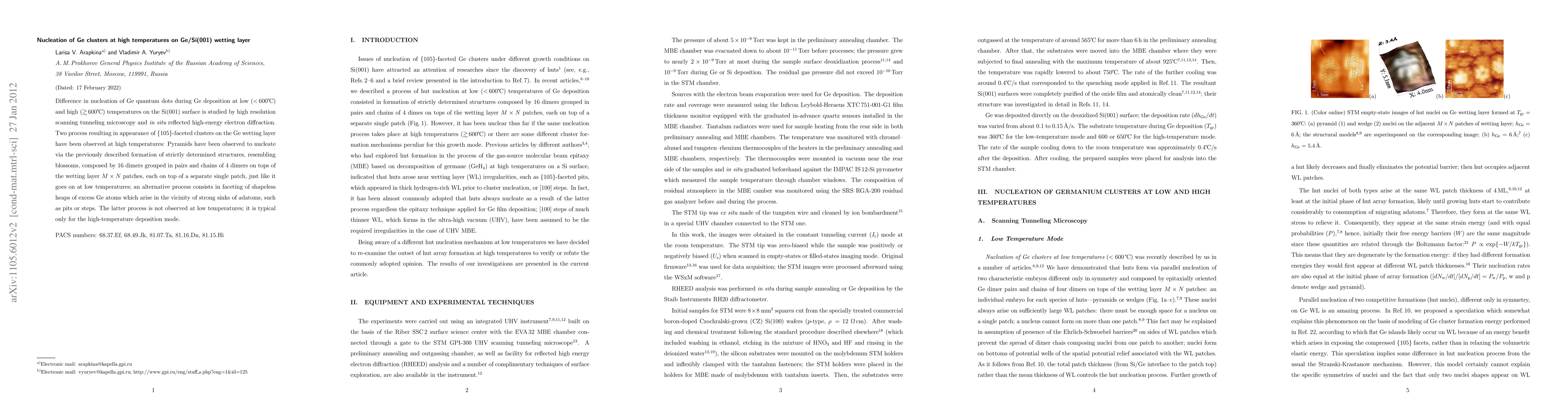This study investigates the nucleation of Ge quantum dots on Si(001) at low and high temperatures using high-resolution scanning tunneling microscopy. At high temperatures, two distinct processes lead to {105}-faceted clusters, including pyramid nucleation via structured M x N patches and faceting of shapeless heaps near adatom sinks, a phenomenon not observed at lower temperatures.
