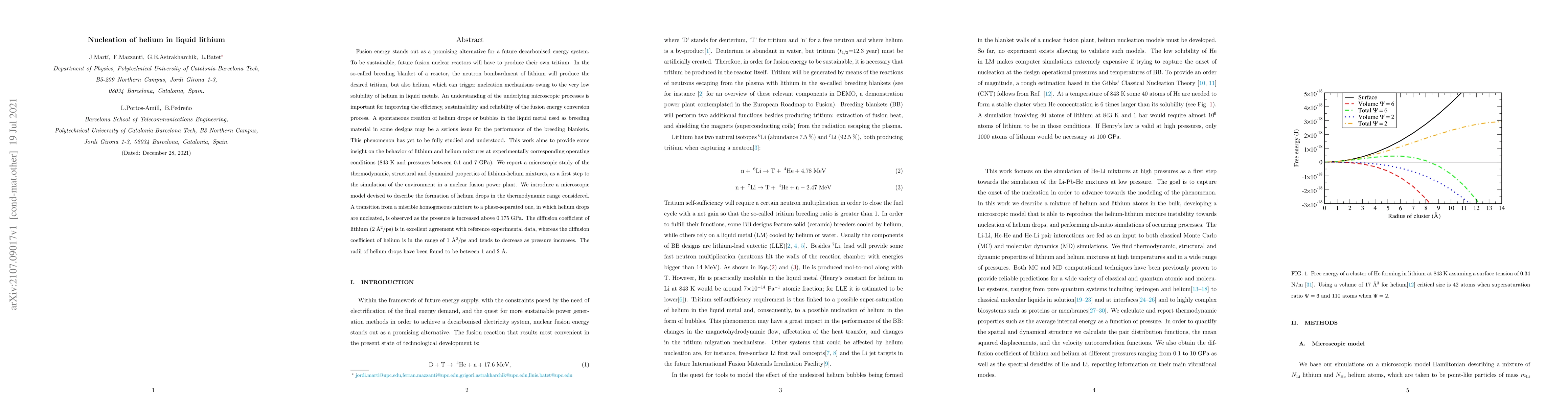 This study investigates the nucleation of helium in liquid lithium under conditions relevant to fusion reactors, observing a transition from a homogeneous to a phase-separated mixture above 0.175 GPa. The microscopic model reveals helium drop formation and provides diffusion coefficients for lithium and helium, highlighting potential issues for fusion reactor performance.