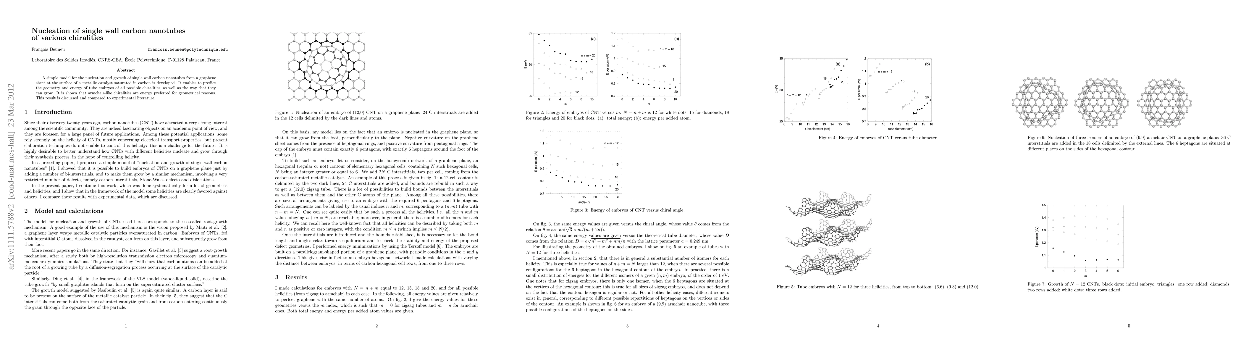 This paper develops a model to predict the nucleation and growth of single wall carbon nanotubes from a graphene sheet on a metallic catalyst, showing that armchair-like chiralities are energetically favored due to geometric reasons, and compares these findings with experimental data.