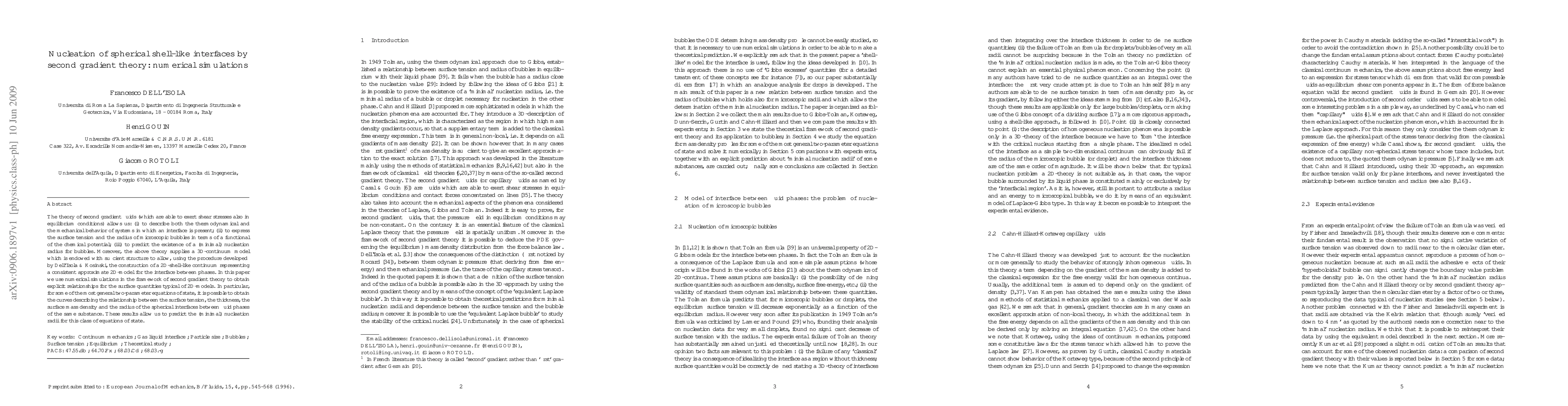 The theory of second gradient fluids (which are able to exert shear stresses also in equilibrium conditions) allows us: (i) to describe both the thermodynamical and the mechanical behavior of systems in which an interface is present; (ii) to express the surface tension and the radius of microscopic bubbles in terms of a functional of the chemical potential; (iii) to predict the existence of a (minimal) nucleation radius for bubbles. Moreover, the above theory supplies a 3D-continuum model which is endowed with sufficient structure to allow the construction of a 2D-shell-like continuum representing a consistent approximate 2D-model for the interface between phases. In this paper we use numerical simulations in the framework of second gradient theory to obtain explicit relationships for the surface quantities typical of 2D-models. In particular, for some of the most general two-parameter equations of state, it is possible to obtain the curves describing the relationship between the surface tension, the thickness, the surface mass density and the radius of the spherical interfaces between fluid phases of the same substance. These results allow us to predict the (minimal) nucleation radii for this class of equations of state.