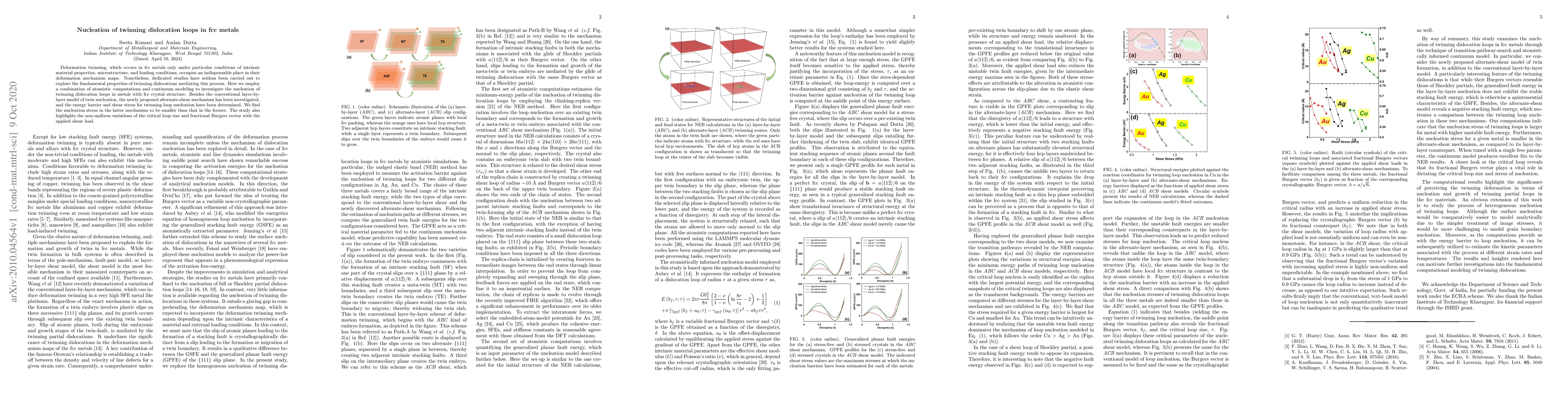 This paper explores the nucleation mechanisms of twinning dislocation loops in face-centered cubic (fcc) metals using atomistic computations and continuum modeling. It identifies the alternate-shear mechanism as having a lower nucleation stress compared to the conventional layer-by-layer model, and discusses the non-uniform variations in critical loop size and fractional Burgers vector with applied shear stress.