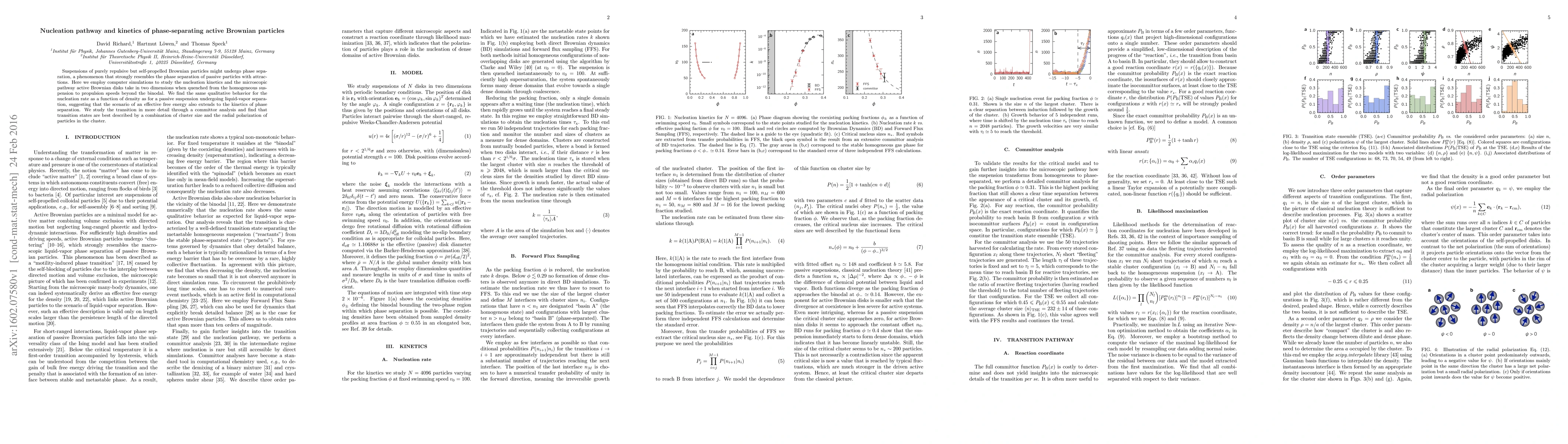 Suspensions of purely repulsive but self-propelled Brownian particles might undergo phase separation, a phenomenon that strongly resembles the phase separation of passive particles with attractions. Here we employ computer simulations to study the nucleation kinetics and the microscopic pathway active Brownian disks take in two dimensions when quenched from the homogeneous suspension to propulsion speeds beyond the binodal. We find the same qualitative behavior for the nucleation rate as a function of density as for a passive suspension undergoing liquid-vapor separation, suggesting that the scenario of an effective free energy also extends to the kinetics of phase separation. We study the transition in more detail through a committor analysis and find that transition states are best described by a combination of cluster size and the radial polarization of particles in the cluster.