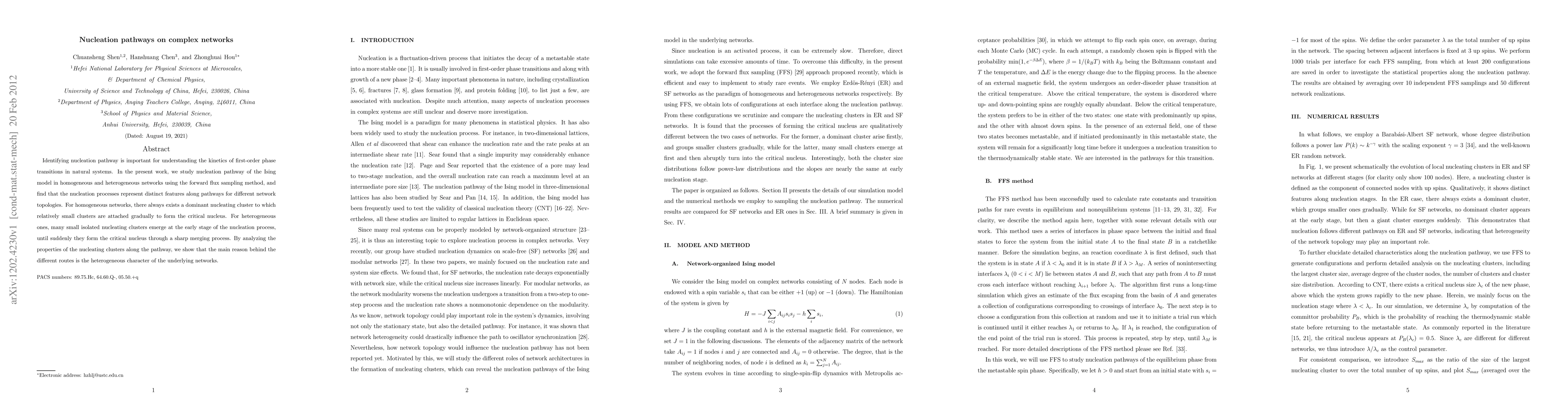 The study explores nucleation pathways in Ising model phase transitions across homogeneous and heterogeneous networks using forward flux sampling, revealing distinct nucleation processes: in homogeneous networks, a dominant cluster forms gradually, while in heterogeneous networks, multiple small clusters merge sharply to form the critical nucleus. The differences are attributed to the network's heterogeneous character.