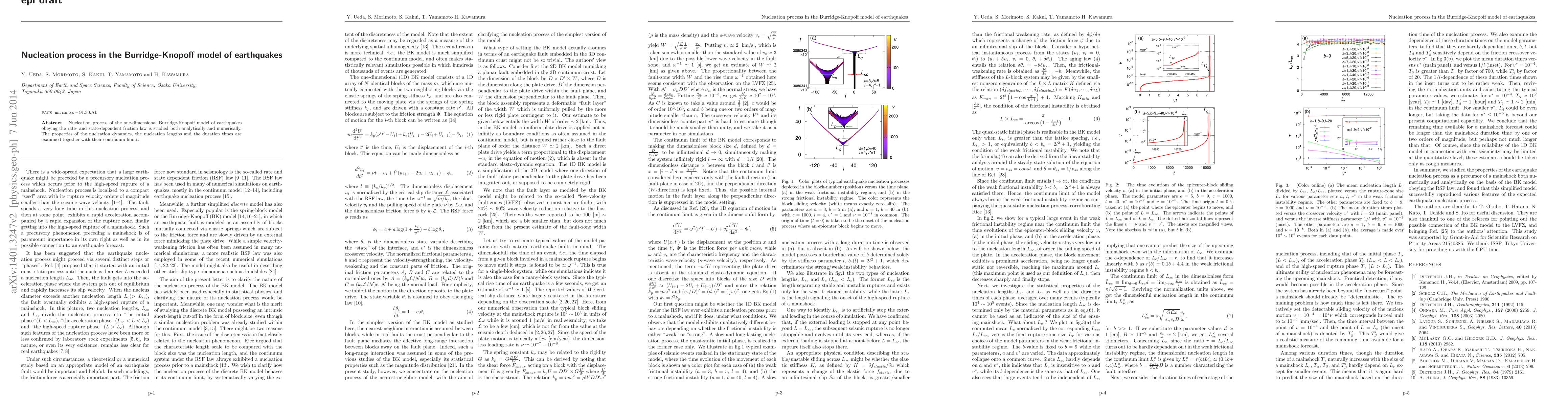 This paper investigates the nucleation process in the one-dimensional Burridge-Knopoff earthquake model under rate- and state-dependent friction, using both analytical and numerical methods to explore nucleation dynamics, lengths, and duration times, and their continuum limits.