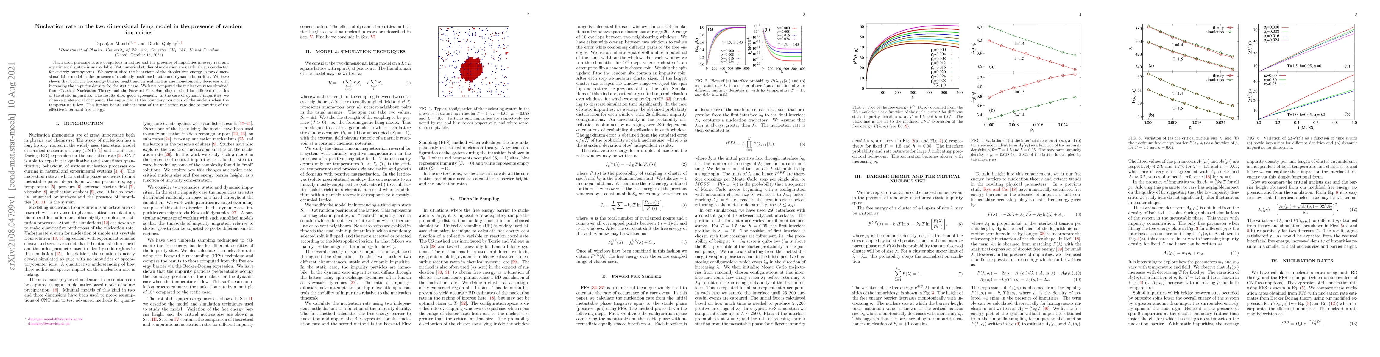 This study investigates the effect of random impurities on nucleation in the two-dimensional Ising model, showing that both the free energy barrier and critical nucleus size decrease with higher impurity density in static cases. The research also finds that dynamic impurities enhance nucleation rates by preferentially occupying nucleus boundaries, lowering interfacial energy.