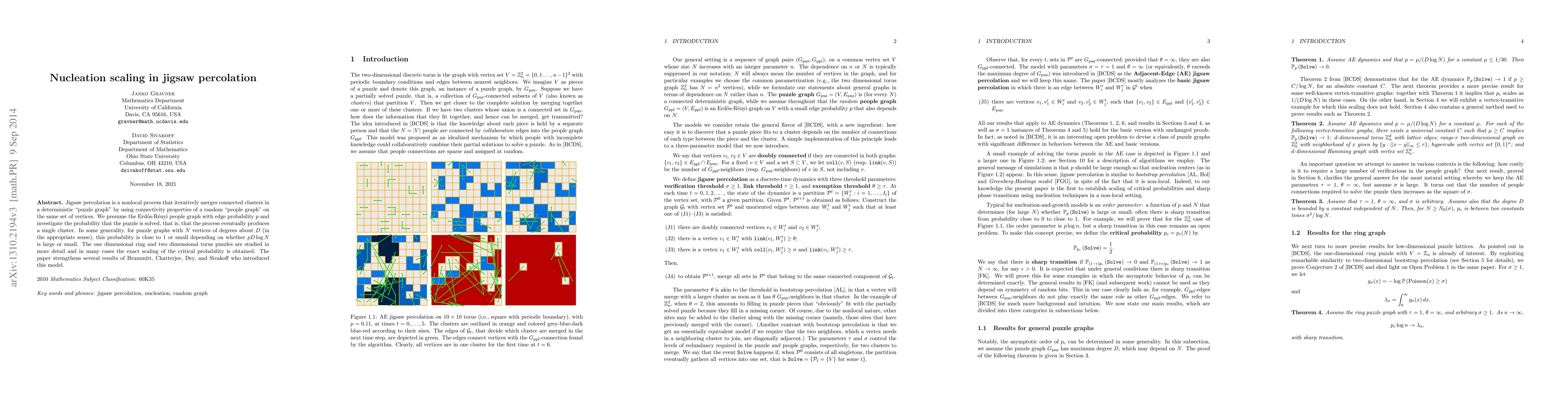 This research investigates jigsaw percolation, a nonlocal process merging clusters using random connectivity. For puzzle graphs with N vertices of degree D, the probability of solving the puzzle (forming one cluster) is nearly 1 or nearly 0 based on pD(log N). Focusing on 1D ring and 2D torus puzzles, the study derives exact scaling of the critical probability, resolving several conjectures posed by Brummitt et al.