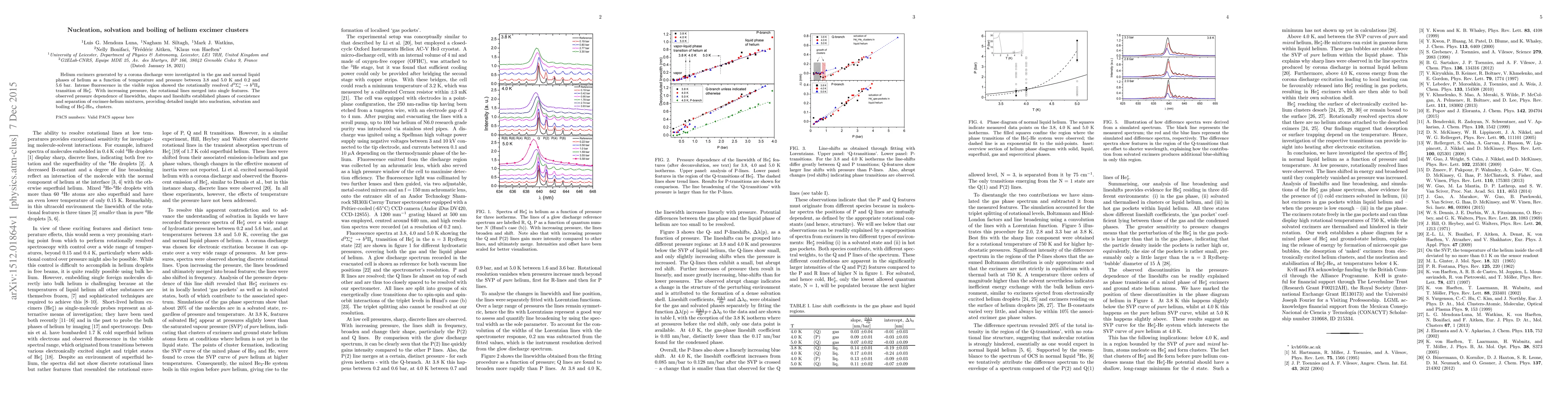 The research investigates helium excimer clusters' behavior in gas and liquid helium phases, revealing phase coexistence and separation through pressure and temperature changes. The study uses rotationally resolved fluorescence to observe the d^3Σ_u^+ → b^3Π_g transition of He_2^*, providing insights into nucleation, solvation, and boiling of He_2^*-He_n clusters.
